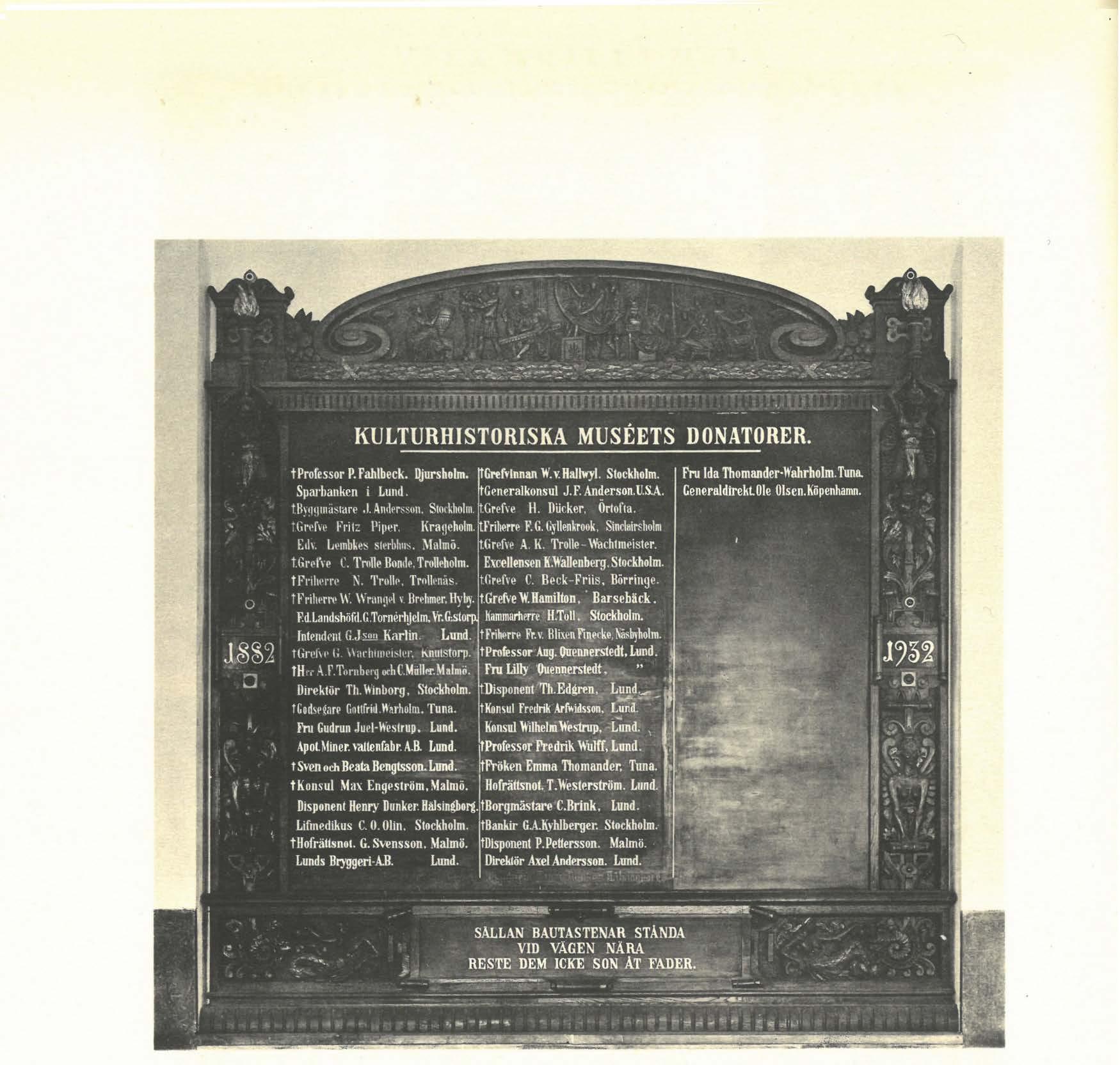 Coyet, Henriette, friherrinna, Torup (b). Dahlberg, K., folkskollärare, Skabersjö (b). Dahlgren, Thorild, fil. doktor, Malmö (b). Dahlqvist, Einar, folkskollärare, Lund. Dela Gardie, Jakob, greve, Maltesholm. Den gamle By, Aarhus. Det kongelige Bibliotek, Köpenhamn. Dickson, Robert, köpman, Göteborg (b). Die Preussische Staatsbibliothek, Berlin. Edstrand, Thckla, fröken, Malmö. Ellwyn, Carl, lasarettsläkare, Katrineholm (b). Erlandsson, Hans, konservator, Lund. Essen-Möller, Elis, professor, Lund. Fabriks- och Hantverksföreningen, Lund. Finlands Nationalmuseum, Helsingfors. Fischer, Axel, tandläkare, Malmö. Fornmark, Aug., doktor, Malmö. Fougstedt, Gustaf, grosshandlare, Malmö. Frenk, Johan, frisörmästare, Lund. Fribergska Museet, Lidköping. Fromell, Maria, fröken, Lmid. Furst, C. M., professor, Lund. Gamstorp, Pehr, borgmästare, Lund. Gotthardt, Herman, direktör, Malmö (b).