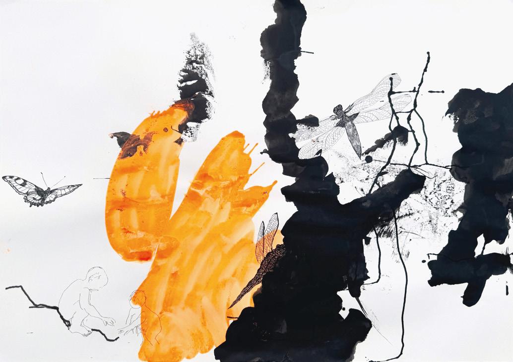 Stefanie Schmeink | Terratopia | 2024 | Tusche, Tinte, Acryl, Pigment auf Fotokarton | 70 x 100 cm