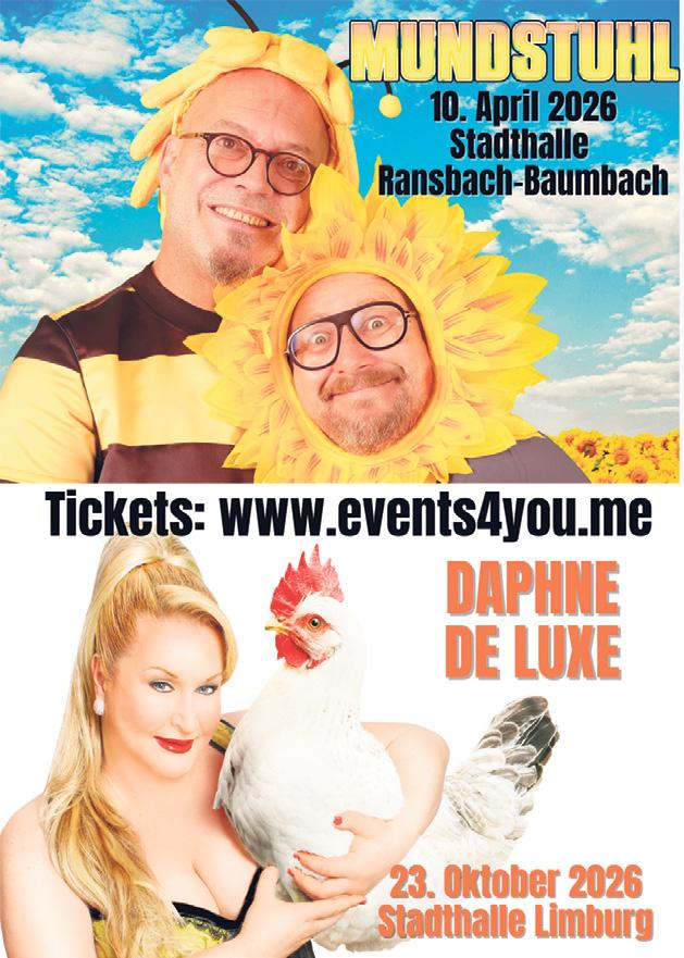 Rhein-Mosel-Halle 20.00 Dennis Alexander Volk. Story Telling Piano Limburg, Stadthalle ............................19.30 Gangkino Circus SONSTIGES Bad Neuenahr, Kurpark 20.00 One Vision – Die Klangwelle 2025 Koblenz, Festung 14.00