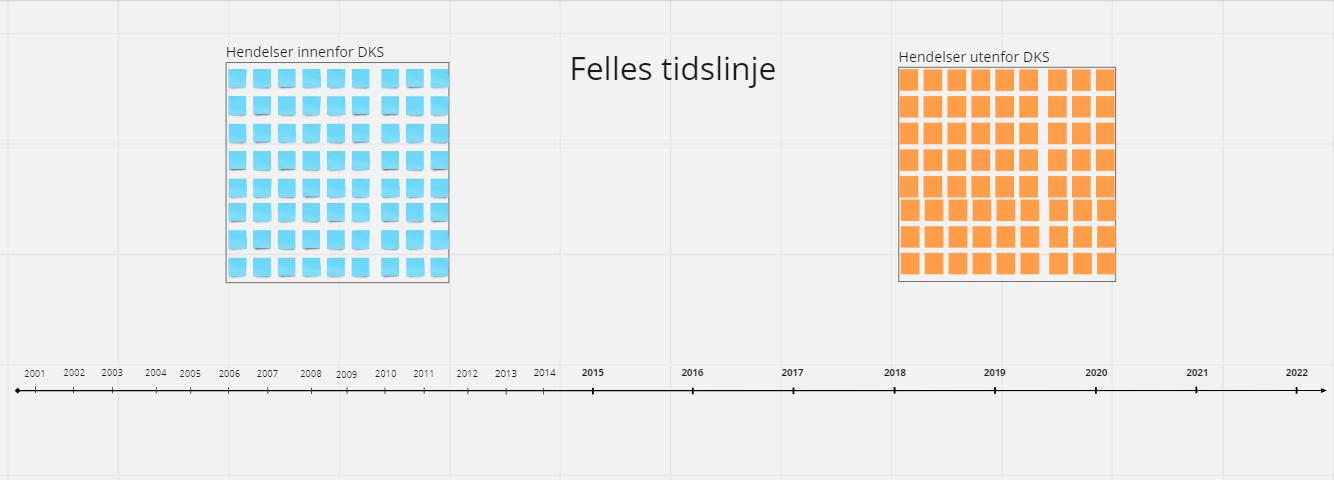 Historieverkstedene besto av enkel tidslinje. Deltakerne ble bedt om å reflektere over endringer som har påvirket utviklingen av DKS i de siste årene. Tidslinjen som ble presentert, gikk fra 2000 til 2022, men med hovedvekt på perioden fra 2015 til 2022, slik figuren illustrerer: