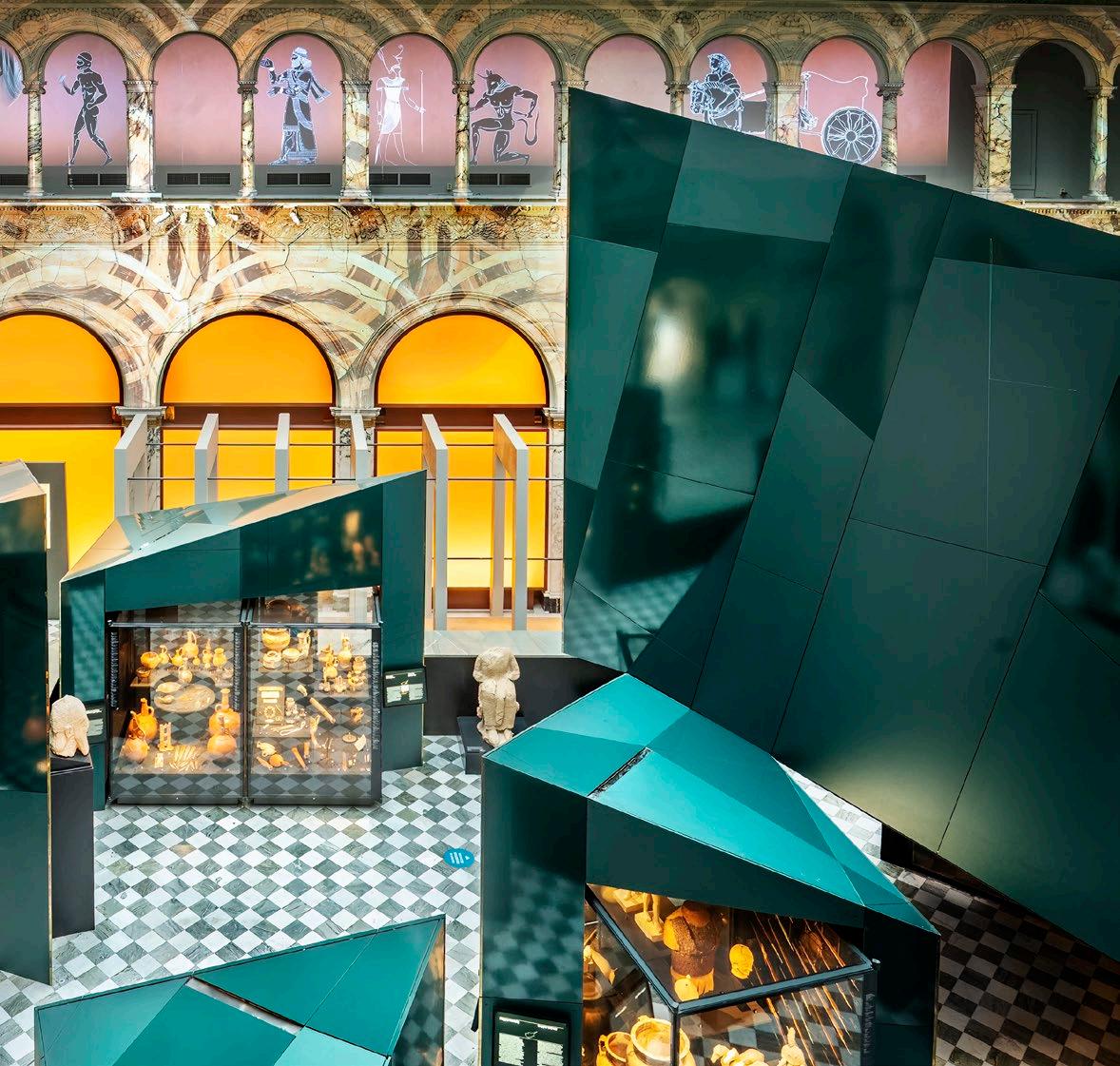 Att bygga utställningar där man måste ta hänsyn till en lång bankdisk som bildar ett U mitt i det som tidigare var den stora banksalen är förstås en utmaning av rang. Något som arkitektfirman White fick tampas med när de designade basutställningen för den cypriotiska samlingen, världens största utanför Cypern.