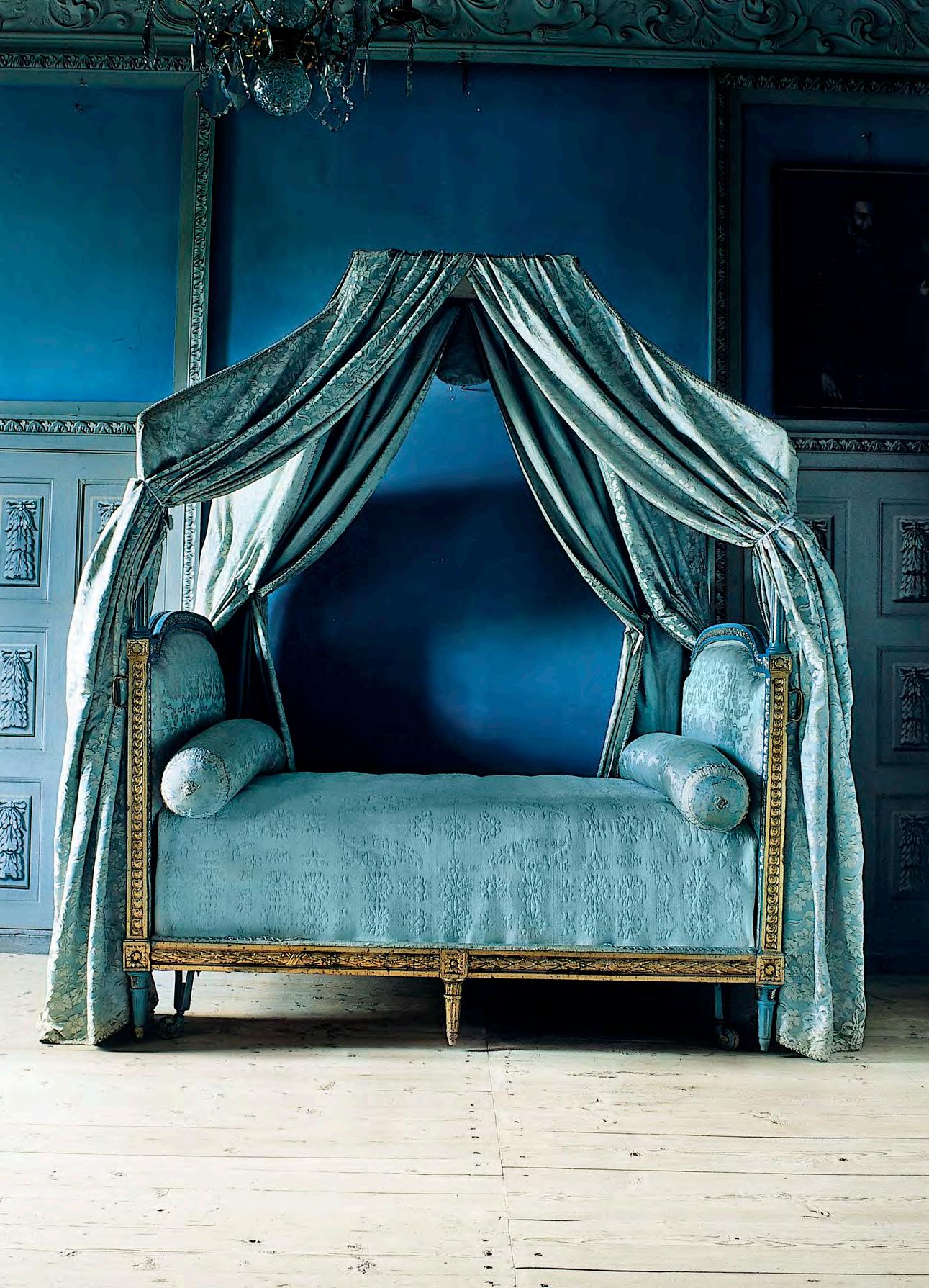 Omslaget Hedvig Elisabet Charlottas ”lit à polonaise” från 1790talet på Rosersbergs slott. Sedan 1838 är den placerad på Skoklosters slott.