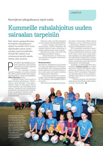 kue pelaa 3. divisioonassa. Miehet johtavat lohkoaan ja ovat jo varmistaneet nousun 2. divisioonaan. Naisetkin ovat lohkonsa kärjessä ja kamppailevat noususta. NJS:n varsinainen kotikenttä on Klaukkalan urheilupuistossa, missä on muun muassa lämmitettävä tekonurmi ja pari vuotta sitten seuran omin voimin pystytetty kuplahalli, jota voidaan käyttää juniorien harjoituksiin. Kesäisin NJS:n toimintaalueella on käytössä Klaukkalan kenttien lisäksi nurmikenttiä myös Nurmijärven kirkonkylässä sekä Rajamäellä. Kummeissa projektipäällikkönä työskentelevä Susanna Laurila on erittäin aktiivisesti mukana Nurmijärven Jalkapalloseuran toiminnassa. Hän on muun muassa 2003 syntyneiden Tikkatyttöjen apuvalmentaja ja toimii joukkueenjohtajana sekä pelaa itse naisten harrastejoukkueessa. – Totta kai toivomme, että tämä NJS:n malli toimisi esimerkkinä muille urheiluseuroille, Laurila sanoo. ●