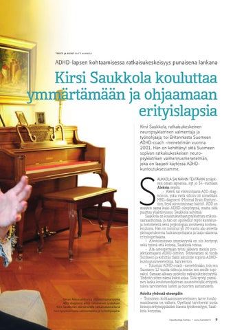 Kirsi Saukkola kouluttaa ymmärtämään ja ohjaamaan erityislapsia Kirsi Saukkola, ratkaisukeskeinen neuropsykiatrinen valmentaja ja työnohjaaja, toi Britanniasta Suomeen ADHD-coach -menetelmän vuonna 2001. Hän on kehittänyt siitä Suomeen sopivan ratkaisukeskeisen neuropsykiatrisen valmennusmenetelmän, joka on laajasti käytössä ADHDkuntoutuksessamme.