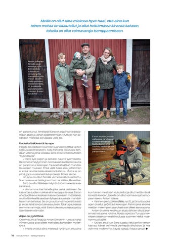 kun toinen meistä on kiukutellut ja ollut heittämässä kirvestä kaivoon, toisella on ollut voimavaroja tsemppaamiseen, Anton toteaa. – Vanhempien poikien (Niilo, nyt 12, ja Eino, 8) vuoksi arjen on ollut pyörittävä koko ajan. Pahimpina aikoina meidän molempien sisarukset ovat olleet isona apuna. Anton on viime kesäkuun alusta lähtien ollut Eeron omaishoitajana kotona, Roosa opettaa Turussa teknisten alojen ammattikoulussa suomen kieltä maahanmuuttajille. – Uskon, että kun Eero tuosta vielä jonkin verran kasvaa, hänet voi viedä perhepäivähoitoon, ja me voimme molemmat käydä työssä, Roosa sanoo. ●