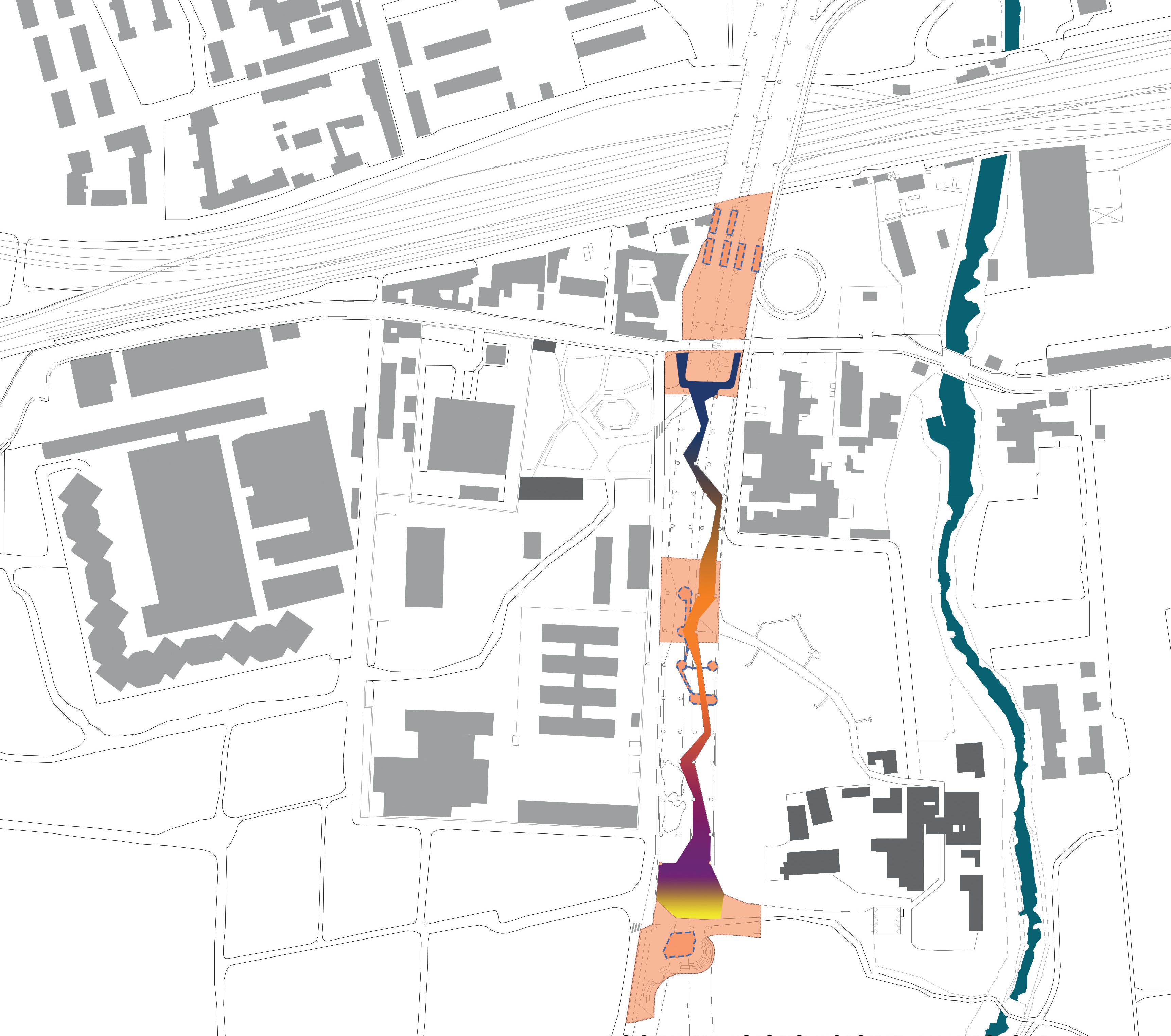 The interactive gateway under the highway bridge at via Corelli, puncturing the boundary of the enclosed park and generating a flow of people and services between the inside and the out side of Grande Parco Forlanini. The gateway is structured like a membrane, funelling and connecting people through the transi tion space with the help of specific devices and activities present in the gateway. A mobility junction, the art junction, as well as the main intersection with it’s piazza are key components of the membrane. The existing structure, the pillars of the bridge, are given additional importance as they are the guiding space shap ing element within the membrane.