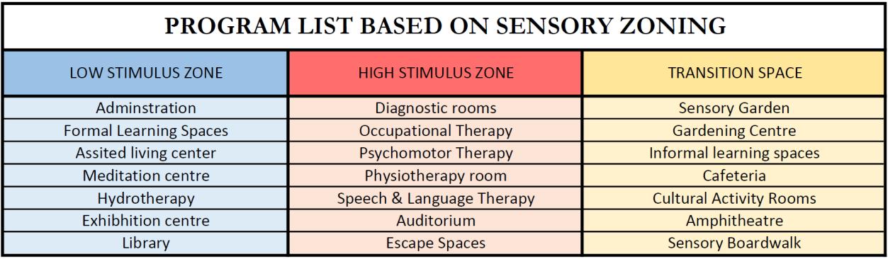 The sensory zoning is based on three parameters i.e. The low stimulus zones, The high stimulus zones and the Transition spaces. Based on which following programs were categorized into their type by determining the activity they have respectively.