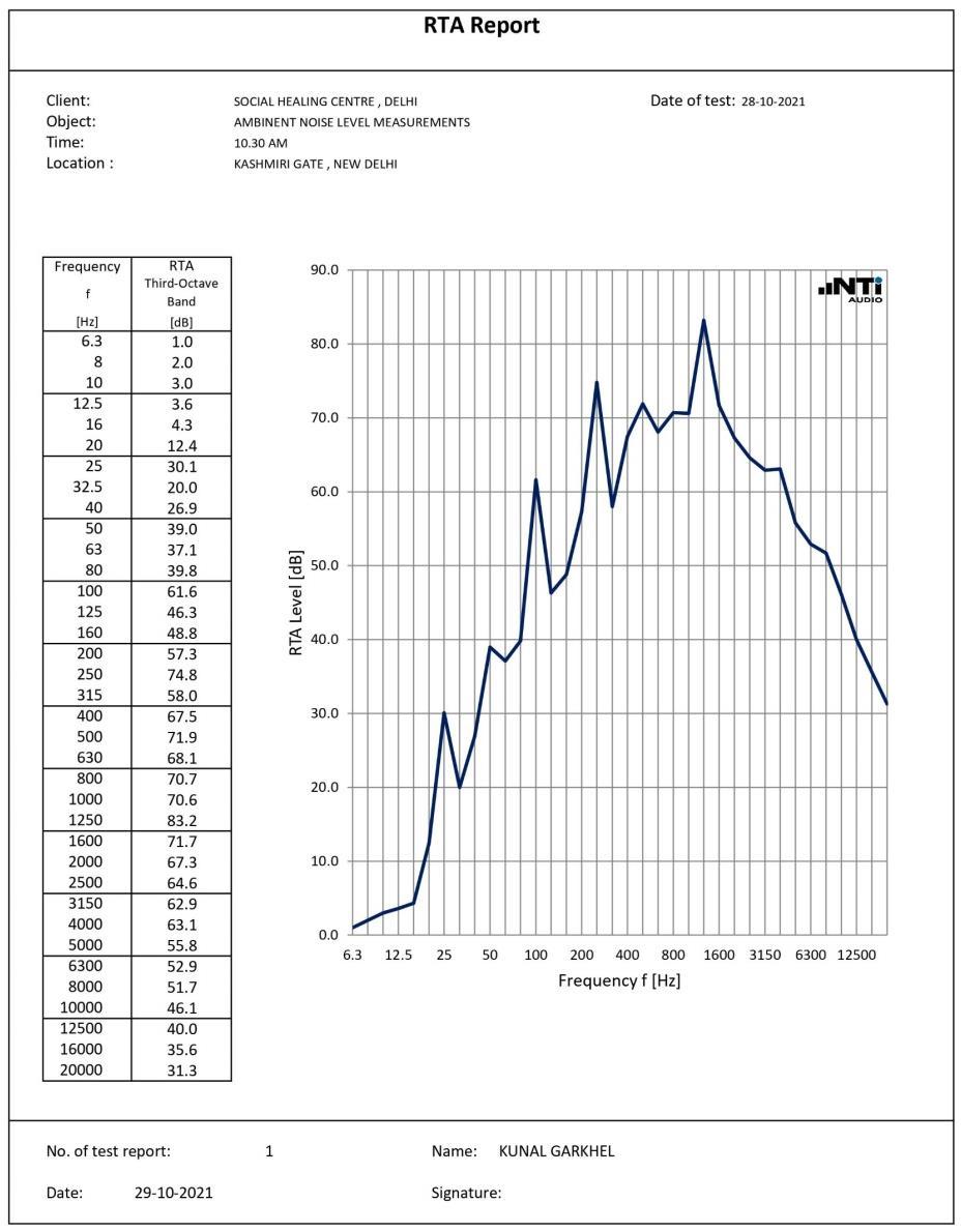 The Real Time Analysis (RTA) test was conducted on 28th October 2021 using the NTi Audio Sound meter and the report on Frequency vs dB level was generated. The readings were taken at 3-time intervals of the day (10:30am, 2:30am and 6:30pm) and then comparative was done to take out the average noise level condition of the site area on a typical day.