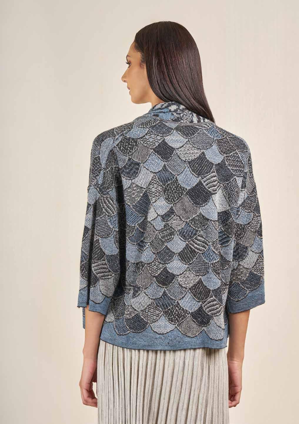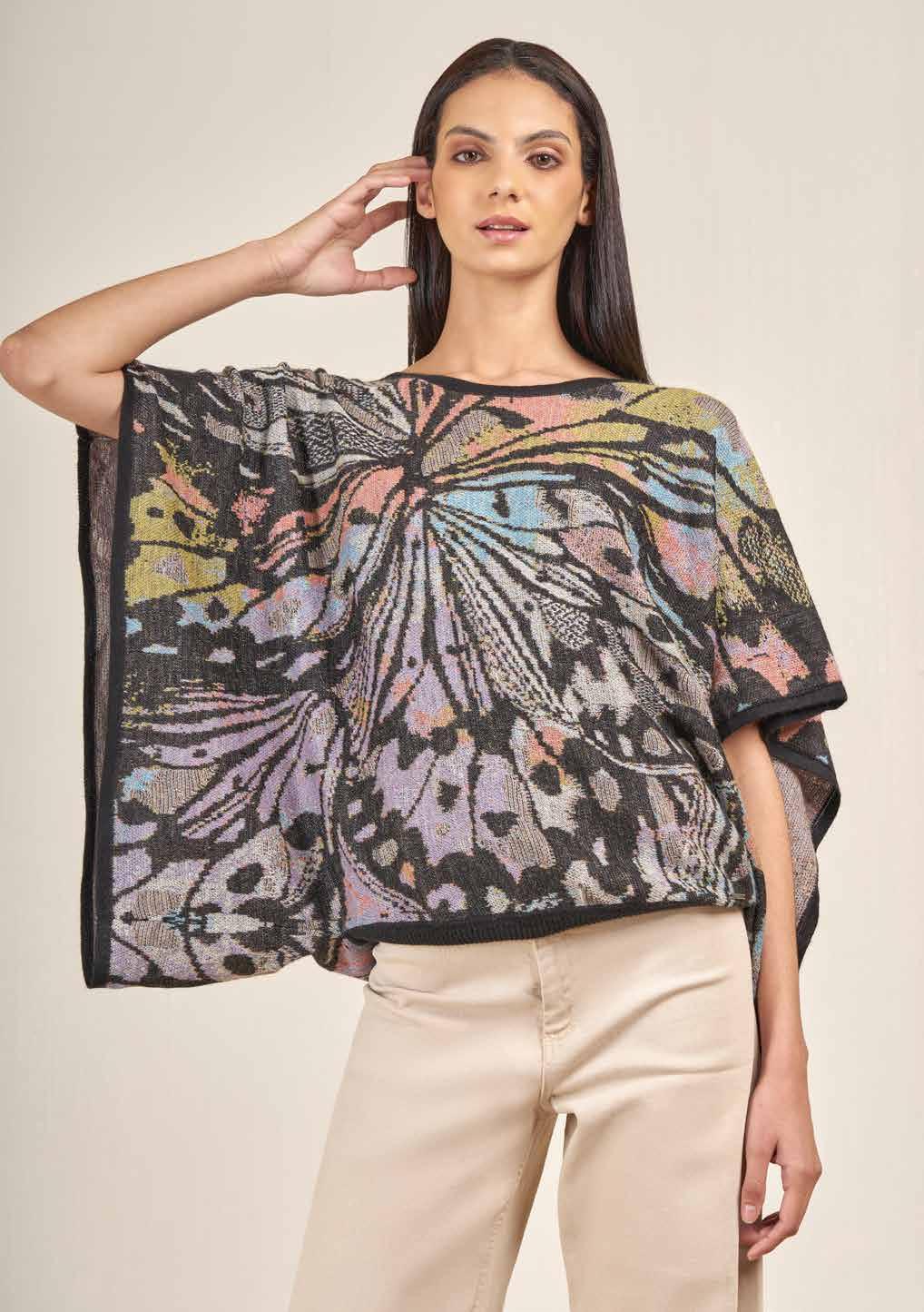 El cárdigan más especial hecho con las más suaves fibras de baby alpaca con seda. Es una prenda reversible, lo que la hace sumamente versátil y tiene un diseño inspirado los distintos tipos de alas de mariposa.