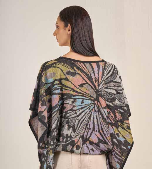 Siente la suavidad de la fibra de baby alpaca con seda en el suéter Verbena. Pieza que representa la colección debido al diseño de mariposa en el tejido de Jacquard. Una mezcla de colores que complementan cualquier tenida.