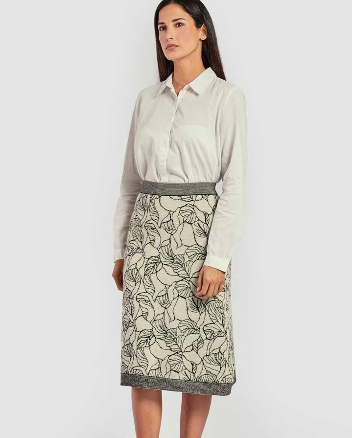 Hermosa falda reversible hecha en 100% baby alpaca con estampado de flores y caída acampanada. Es una prenda cómoda y holgada que no puede faltar en tu clóset.