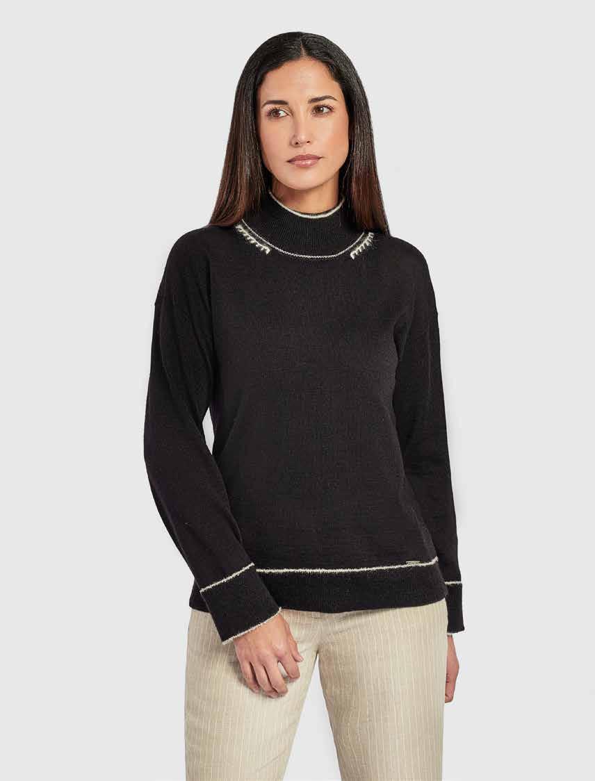 Versatilidad y suavidad. Este suéter de incomparable mano y diseño urbano está hecho100% con baby alpaca. Lleva detalle de alcantar en los hombros.