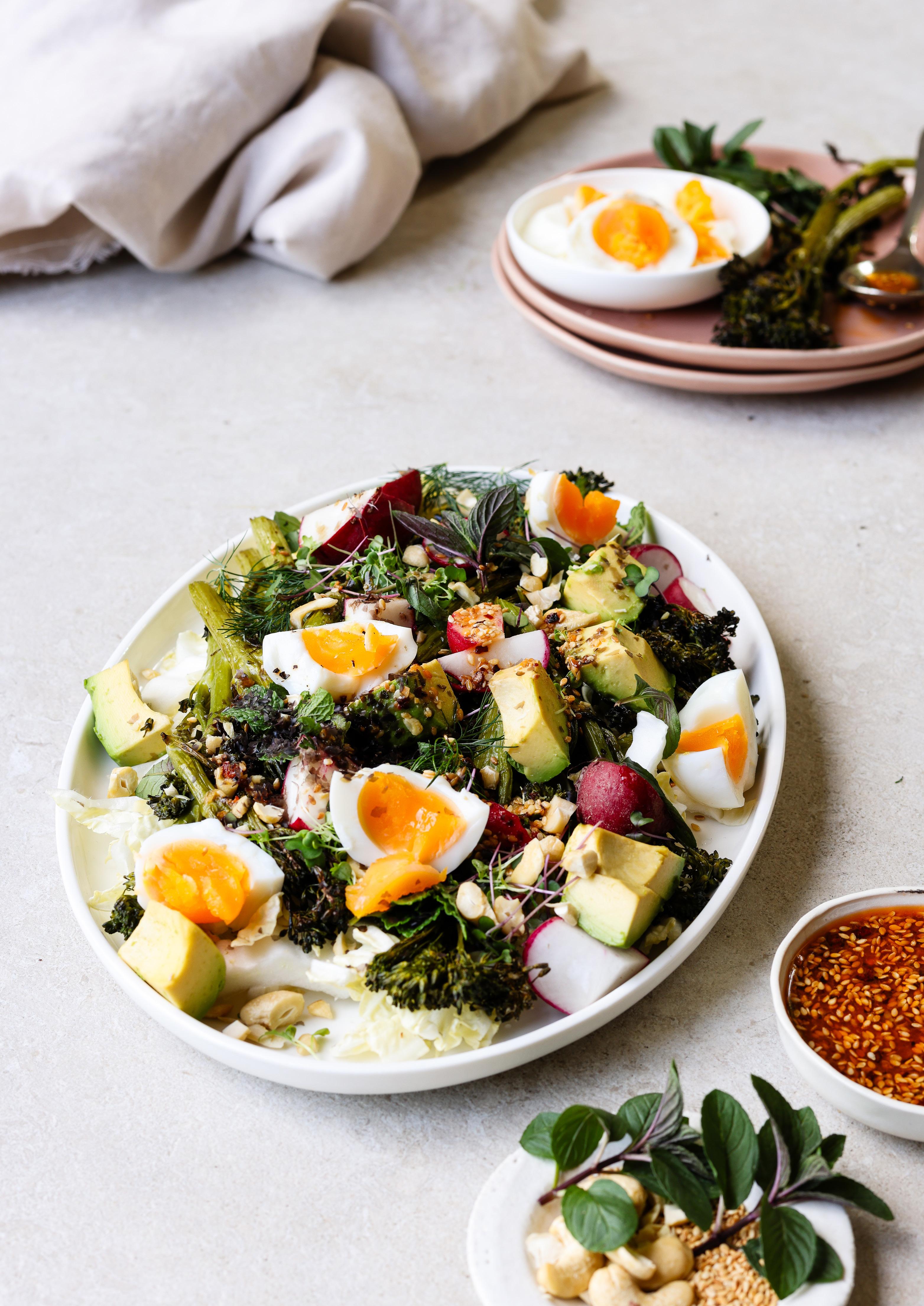 5. To plate, layer the shredded cabbage & then the charred broccolini on a large serving platter. Scatter the avocado, micro greens, herbs & radishes around. Cut the eggs & layer them in & around the other elements. Finish with the nori sprinkle, toasted nuts & prepared dressing.