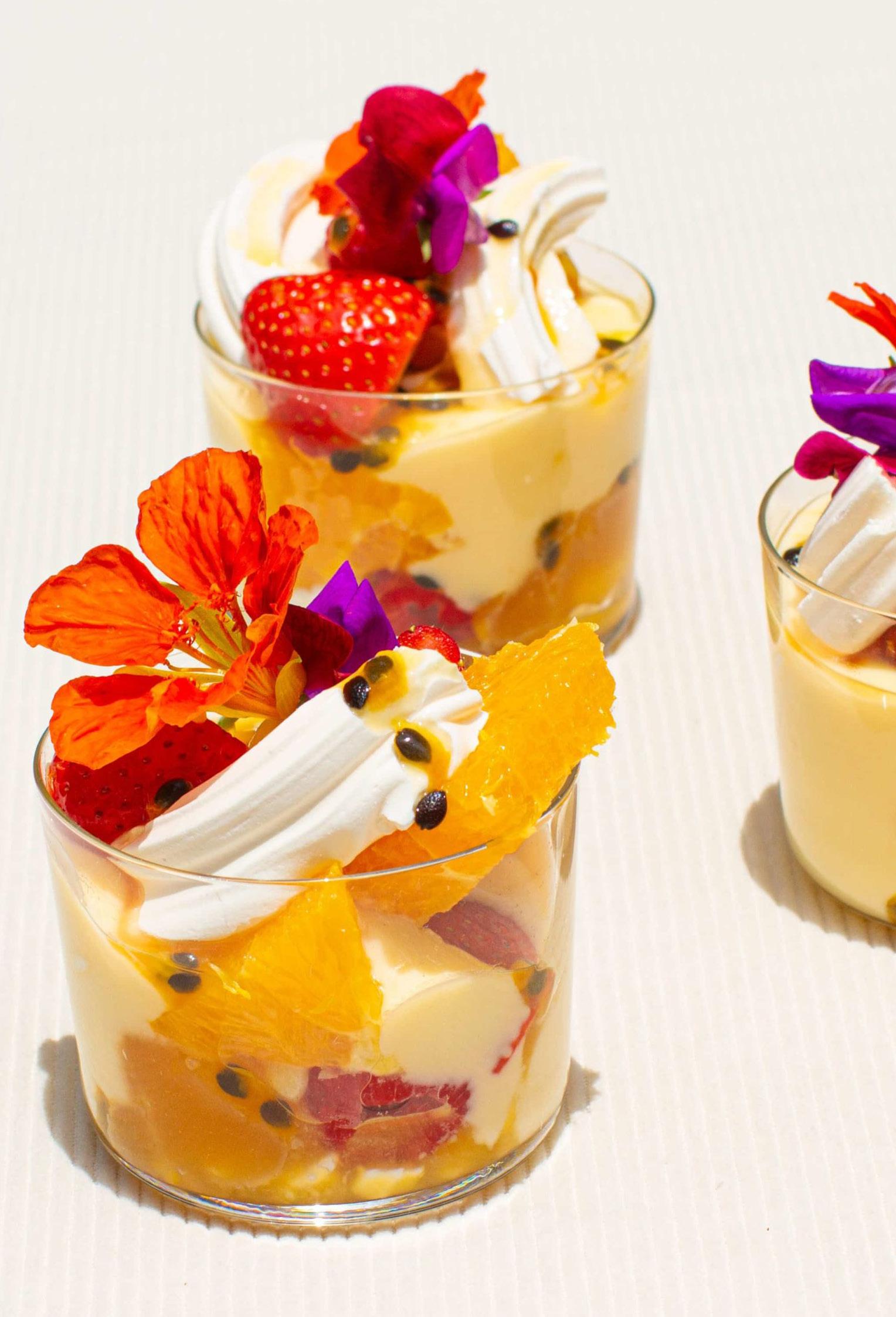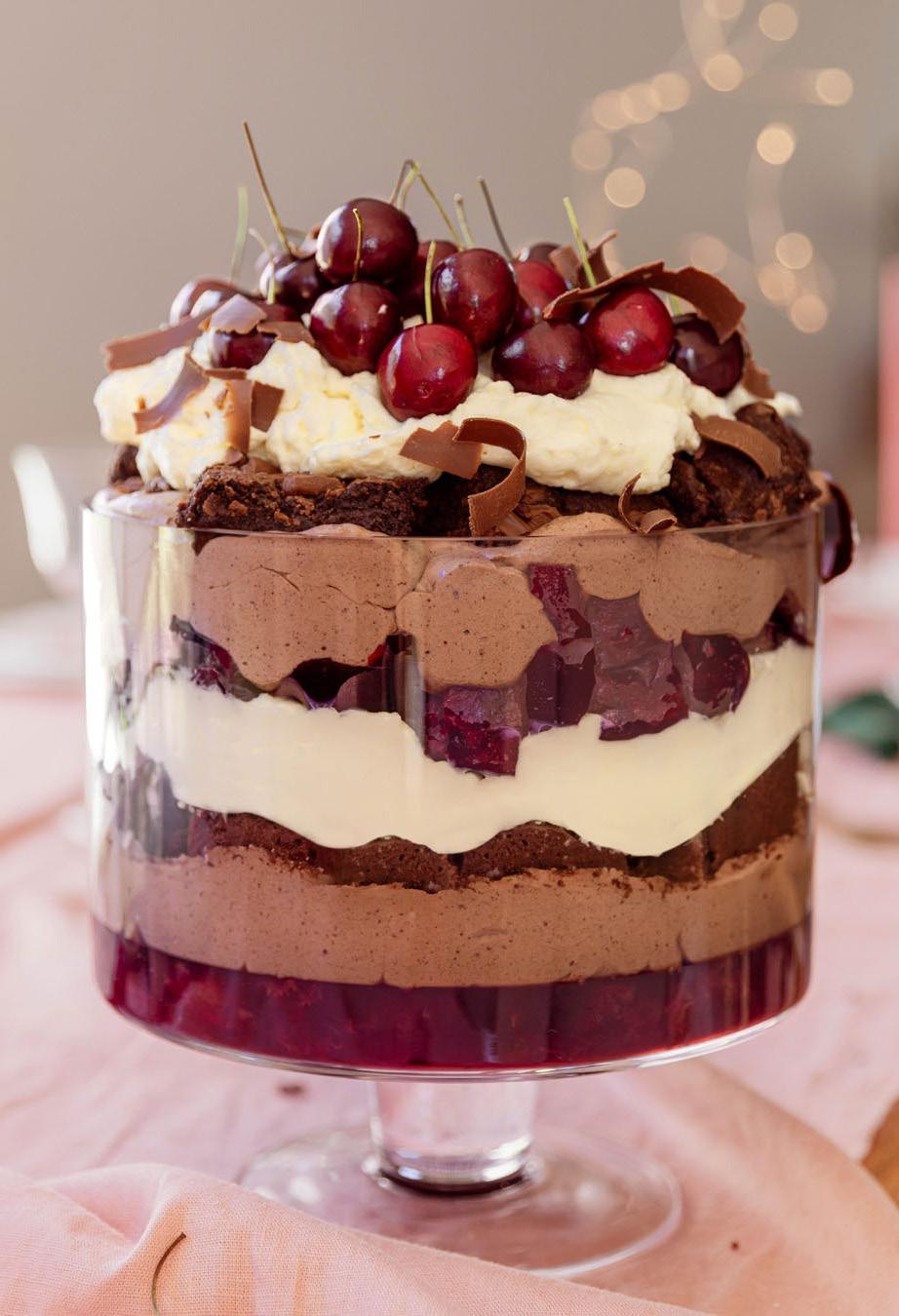 3. Assemble the trifle: Layer the ingredients in a trifle bowl, top with whipped cream, fresh fruit & shavings of chocolate.