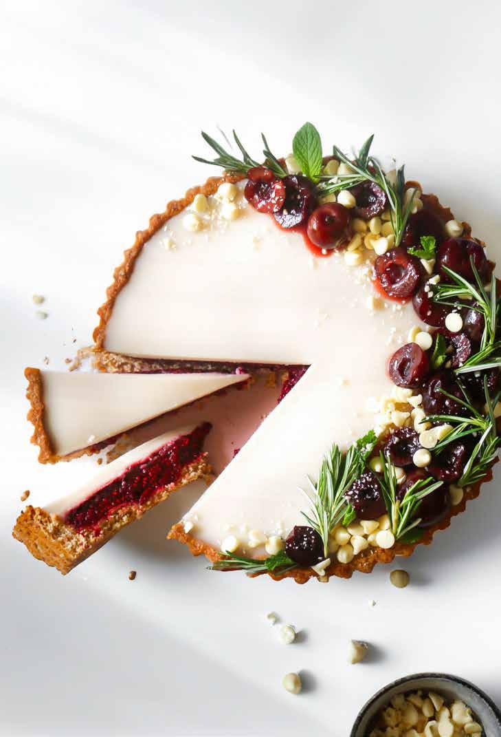 8. Once completely set, you may like to top with fresh cherries, rosemary & extra chocolate chips. Use a hot knife to slice the tart & serve immediately.