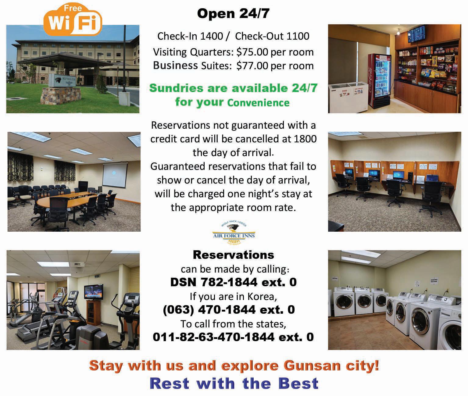 intended. www.dragonhilllodge.com Room Package D S N : # 3 1 5 - 7 3 8 - 2 2 2 2 o r # 0 2 - 7 9 0 - 0 0 1 6 e x t . 1 6 Days / 5 Nights reservations@dragonhilllodge.com TIME TO TIME TO EXPLORE SEOUL! EXPLORE SEOUL! $499 Stay at Dragon Hill Lodge to be right in the center of Seoul's attractions, and also enjoy onsite access to services and facilities serving our U S military and DoD communities. U S A G Y O N G S A N Paid Ad. No federal endorsement of advertiser intended. 53