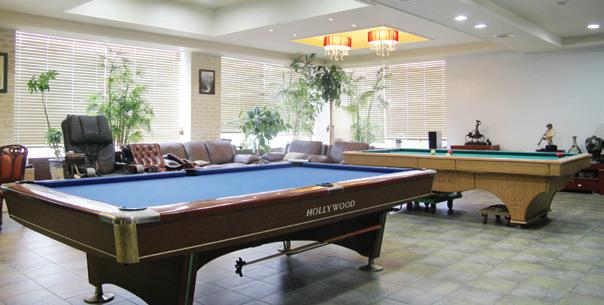 - Lounge area with business center, billiard tables, massage chair, TV, cold drinks