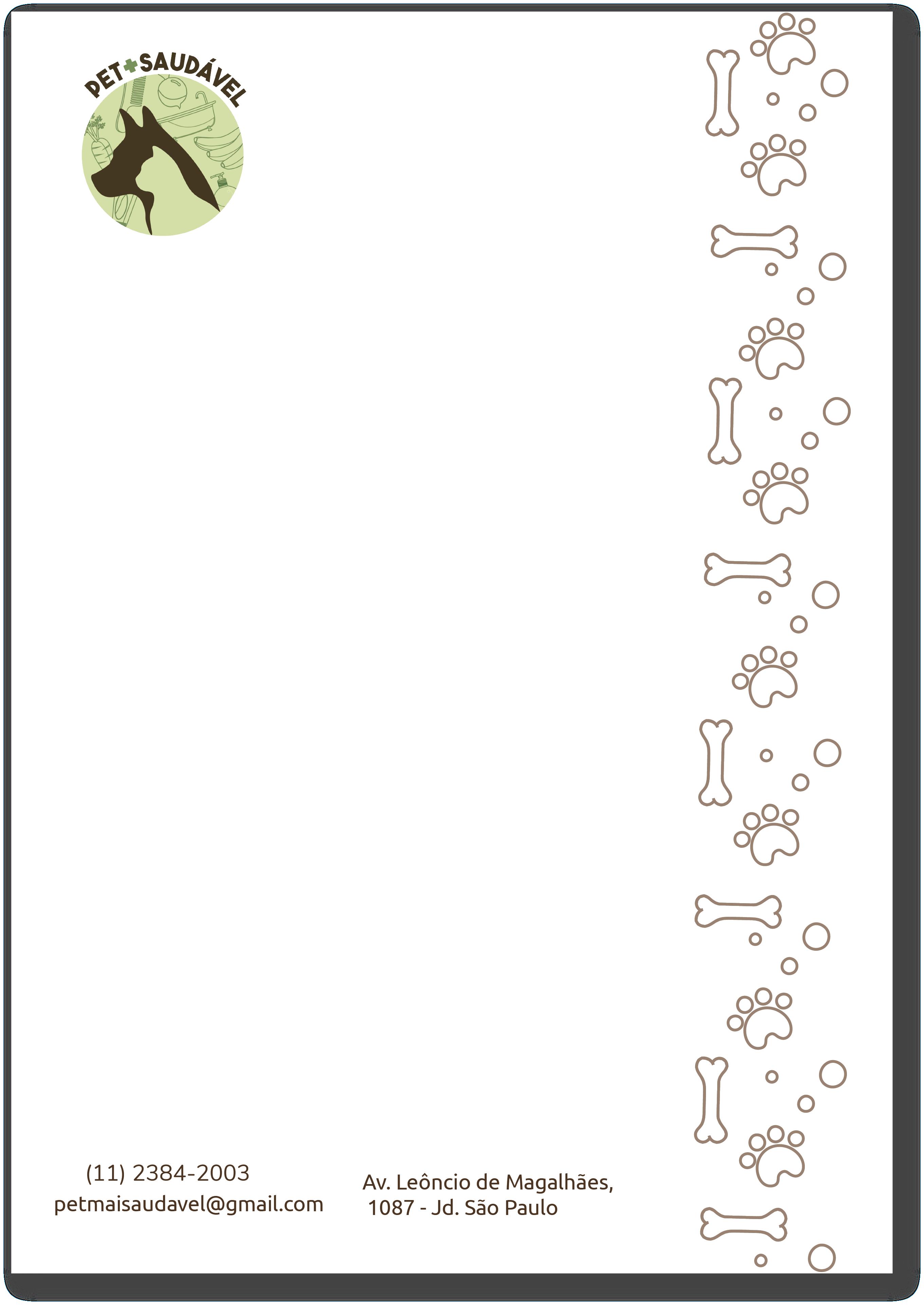 O logotipo principal conversa diretamente com posicionamento do Pet + Saudável, trazendo consigo aspectos modernos. Sendo aplicado preferencialmente com as letras marrom e verde para facilitar a leitura em diferentes ambientes online e offline, mas existe também a versão com as letras brancas que pode ser usada quando não é possível aplicar a principal. Ademais, foram desenvolvidas as versões horizontal e simplificada, para agregar maior visibilidade ao contexto visual do Pet Shop.