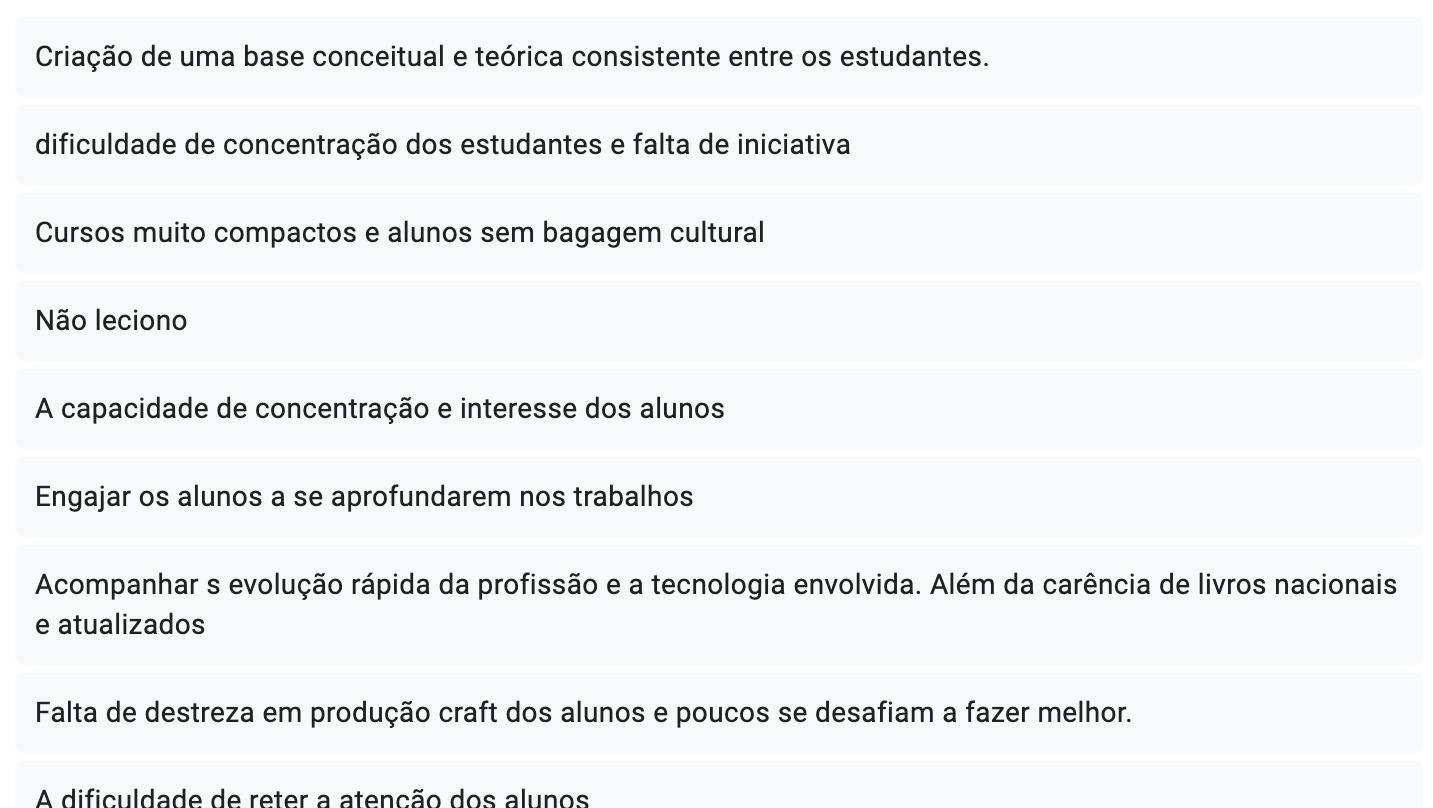 Fernanda Eu acho que cria também aquela coisa de você pode ir fazer de qualquer lugar, por qualquer, tipo assim, você se conecta de uma maneira mais fácil também. Mas em relação aos alunos, você sente que eles dizem algo sobre isso? Sobre tipo, querer mais presencial ou ter mais engajamento no online, menos pessoas vão para o presencial?
