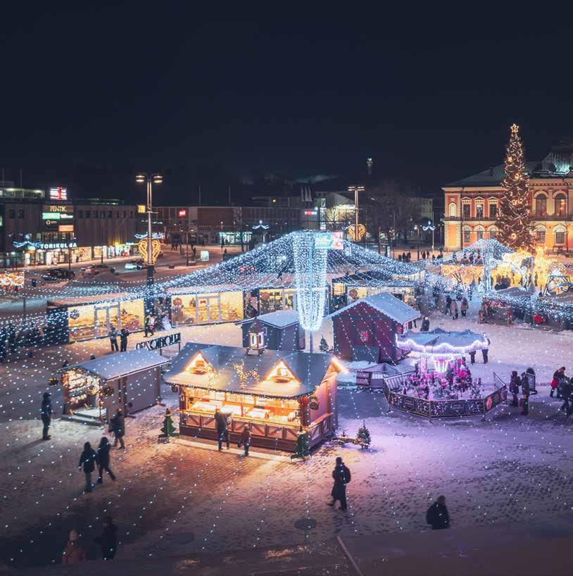 Useasti Suomen parhaan torin tittelin voittanut Kuopion Kauppatori eli Mualiman napa muuntuu joulukuussa Suomen kauneimmaksi joulutoriksi. Söpöt ostoskojut, jouluravintolat, parikymmenmetrinen kuusi, karuselli, lasten kelkkamäki ja koko komeuden kruunaava valtava valokatos tekevät torista talvisesongin sydämen. Täydellinen paikka tallentaa kameraan ilon ja valon juhlan tunnelmaa.