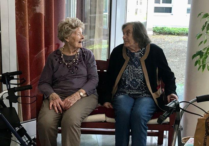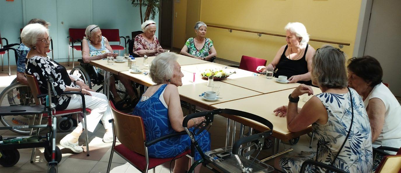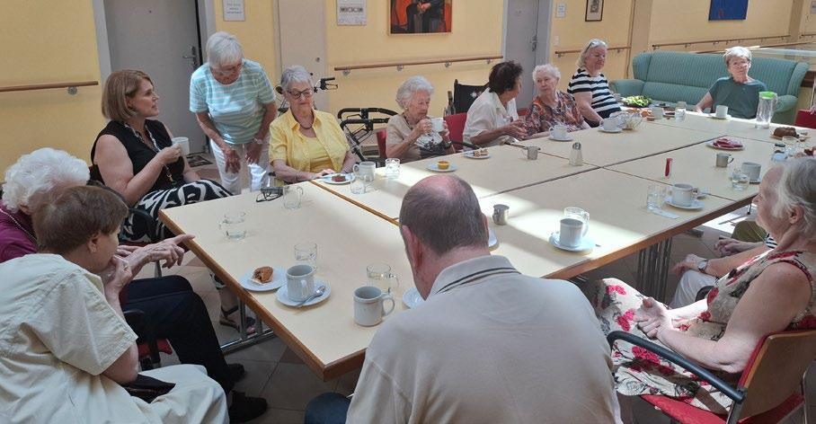fee und/oder ihr*sein Glas Wasser bekam. Mittels Aushang in allen Stockwerken beworben, strömten bereits beim ersten Kaffeekränzchen zahlreiche neugierige Damen und Herren herbei. Ganz beseelt und vergnügt saßen nun also unsere Bewohner*innen aus den Stationären Bereichen mit jenen der Appartements knappe eineinhalb Stunden beisammen und plauderten angeregt. Für die darauffolgende Woche änderten wir lediglich die Anzahl und Aufstellung der Tische und sorgten für mehr Sessel und es kamen sogar noch mehr Personen