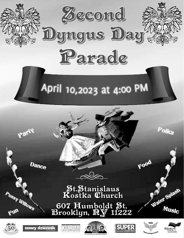 Dzieñ Dyngusa zwany równie¿ Œmigus-Dyngus to tradycyjny polskie œwiêto, które odbywa siê w poniedzia³ek po Wielkanocy i œwiêtuje zakoñczenie obchodów Wielkiego Postu. Najbardziej kojarzy siê nam z polewaniem wod¹ za pomoc¹ ró¿nych psikawek np. w kszta³cie jajka symbolizuj¹cych „wodê œwiêcon¹” oraz z „baziami wielkanocnymi”. Jest obchodzony na ca³ym œwiecie, i choæ najwiêksza parada odbywa siê w Buffalo w stanie Nowy Jork to w zesz³ym roku po raz pierwszy odby³a siê w Nowym Jorku na Greenpoincie. Honorowym goœciem by³ Stan Borys. W tym roku równie¿ bêdzie otwiera³ Paradê. Zapewniamy wiele atrakcji dla dzieci, polewanie wod¹, pyszne jedzenie, œpiew i gwarantowana œwietna zabawa.