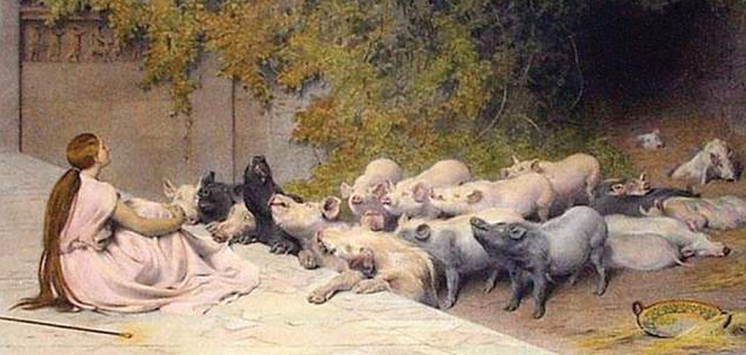 Pierwszym i podstawowym w¹tkiem œwiñskim jest oczywiœcie temat z Odysei. W wêdrówce do domu bohater trafia na wyspê czarownicy Kirke, która podstêpnie przygotowuje napar zaklêty. Po jego wypiciu towarzysze Odyseusza zamieniaj¹ siê w wieprze; sam bohater dziêki swemu – przys³owiowemu póŸniej – sprytowi unikn¹³ tej degradacji. W¹tek bardzo znany, ale unikany w sztuce, zapewne z powy¿szego wzglêdu: œwinie to nie by³ temat wznios³ego przedstawienia.