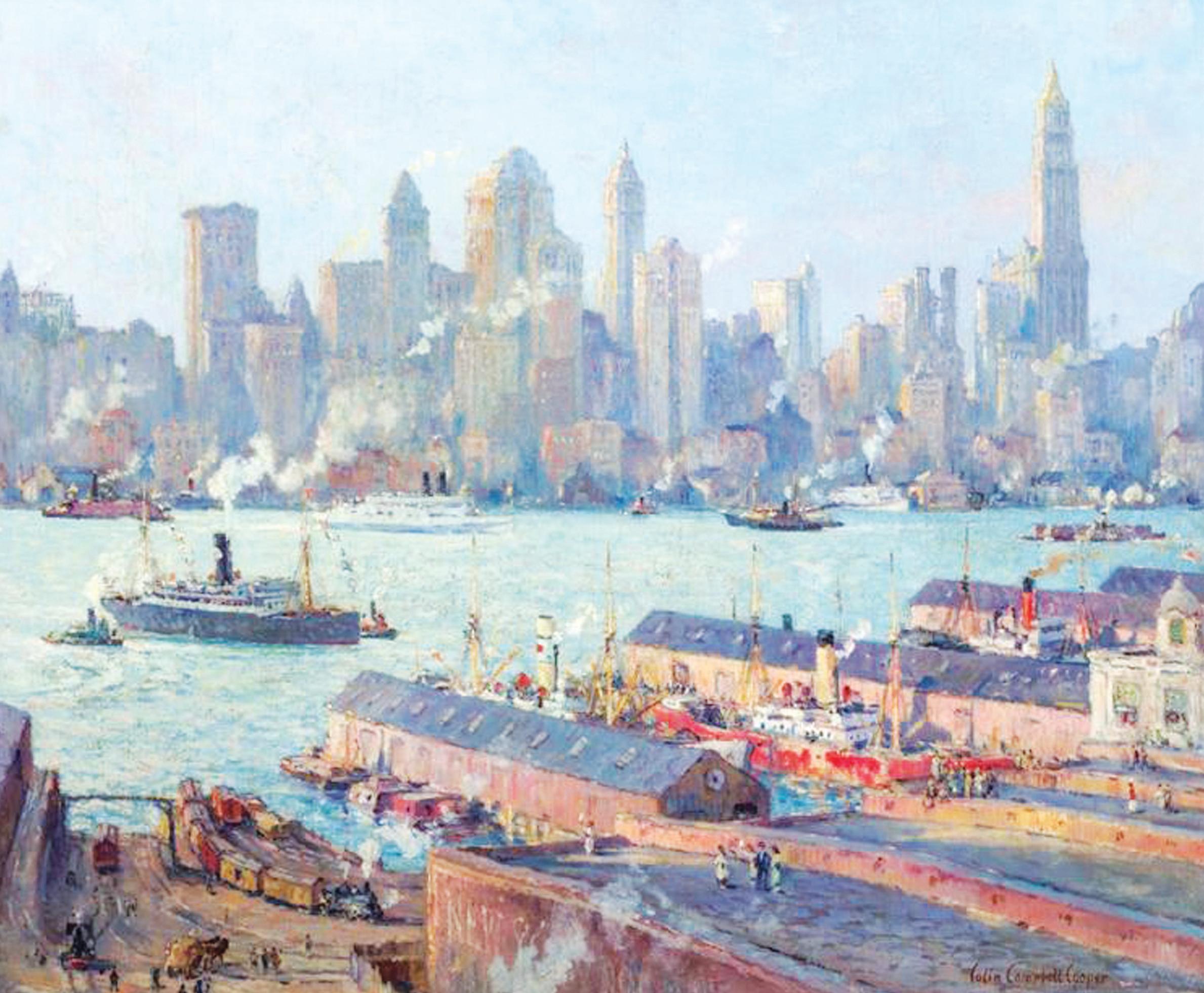 Trudno dziœ rozpoznaæ ówczesne, przedstawione na p³ótnie Coopera, budowle. Zapewne wiele ju¿ do naszych czasów zburzono, aby zbudowaæ nowoczeœniejsze, bardziej funkcjonalne; byæ mo¿e ponios³a artystê trochê fantazja –podobnie jak anonimowego twórcê XVII-wiecznego Londynu i domalowa³ parê wie¿owców, aby stworzyæ wra¿enie nowoczesnego miasta, które pnie siê w górê. Jeœli jednak wci¹¿ stoj¹, tak jak budynek municypalny (na lewo od przysadzistej budowli usytuowanej centralnie), czy gmach Woolwortha (na prawo), to s¹ dziœ ca³kowicie zakryte nowymi drapaczami chmur. Miasto w porannej, mglistej poœwiacie, jak¹ czêsto widzimy latem, prezentuje siê atrakcyjnie. Cooper namalowa³ tylko niewielk¹ czêœæ Nowego Jorku: ruchliwy, przemys³owy Brooklyn i finansow¹, biurow¹ czêœæ Manhattanu. To miasto, par excellence ówczesnych czasów, gdzie wre praca, funkcjonuje przemys³, gdzie obraca siê du¿ymi pieniêdzmi. Tu powstaje nowoczesna Ameryka, tutaj kszta³tuje siê wp³yw na losy œwiata. ❍