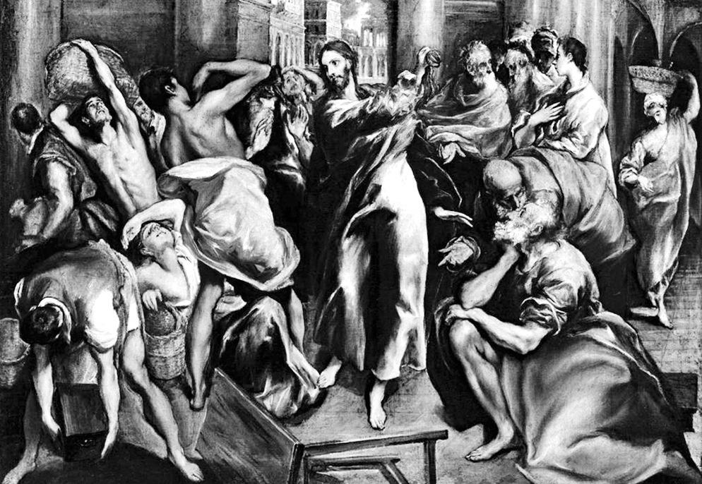 Zbli¿a³a siê pora Paschy ¿ydowskiej i Jezus przyby³ do Jerozolimy. W œwi¹tyni zasta³ siedz¹cych za sto³ami bankierów oraz tych, którzy sprzedawali wo³y, baranki i go³êbie. Wówczas sporz¹dziwszy sobie bicz ze sznurów, powypêdza³ wszystkich ze œwi¹tyni, tak¿e baranki i wo³y, porozrzuca³ monety bankierów, a sto³y powywraca³. Do tych zaœ, którzy sprzedawali go³êbie, rzek³: „Zabierzcie to st¹d i z domu mego Ojca nie róbcie targowiska!” Uczniowie Jego przypomnieli sobie, ¿e napisano: „Gorliwoœæ o dom Twój poch³onie Mnie”. (J 2, 13-17)