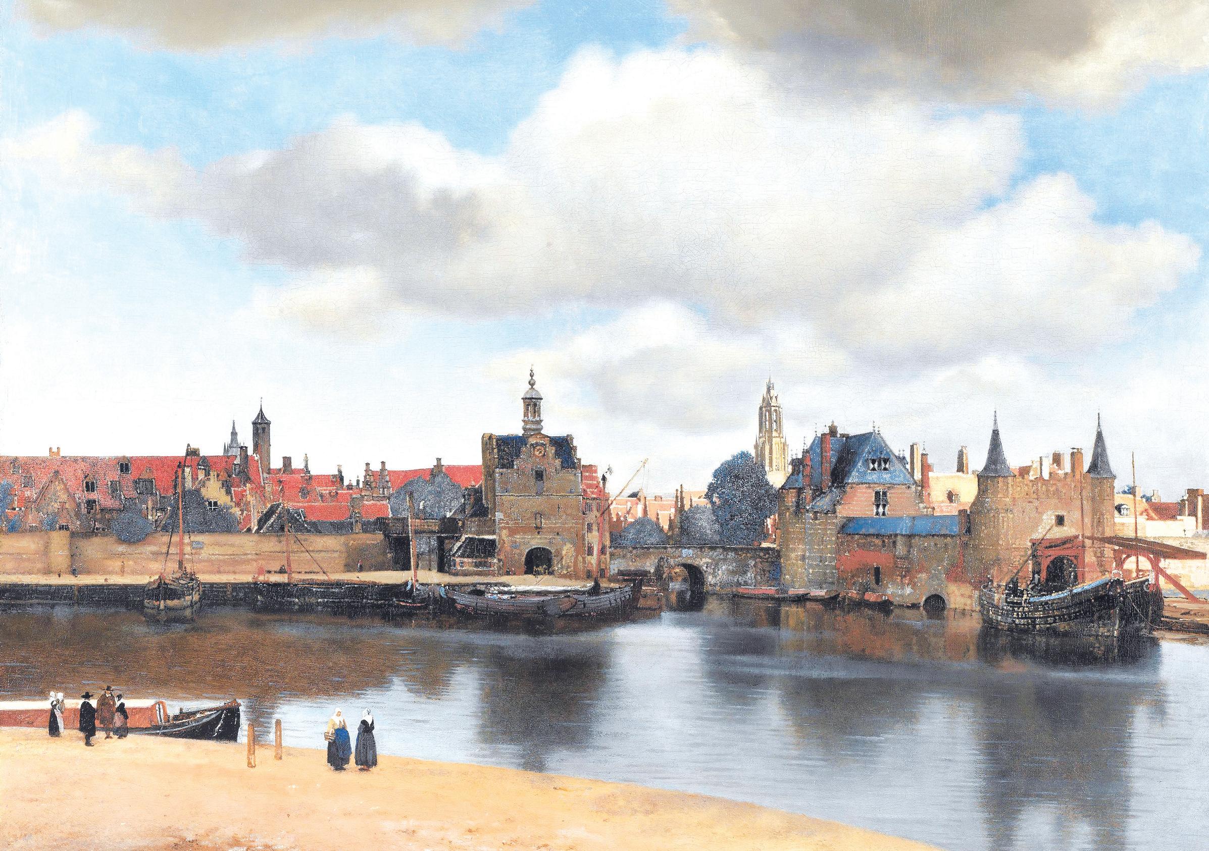 Bodaj najs³ynniejszym z tego typu krajobrazów jest bardzo znane dzie³o Johannesa Vermeera „Widok Delft”, czyli rodzinnego miasta holenderskiego artysty. Obraz wykonany w typowym dla tego malarza stylu: sceneria miejska, a panuje w niej niezwyk³y spokój. Rozproszone œwiat³o równomiernie eksponuje wszystkie elementy pleneru, co sprawia wra¿enie bezruchu, zastygniêcia w czasie. Ani budynki, ani nieliczne postaci nie rzucaj¹ cienia. W spokojnej, g³adkiej wodzie odbity refleks zabudowañ nadbrze¿nych. Zastój. Barki na drugim brzegu stoj¹ nieruchomo zacumowane, bêd¹ potrzebne, gdy trzeba bêdzie je za³adowaæ i wyp³yn¹æ z towarem. W g³êbi z bramy po lewej od kamiennego mostu wychodzi grupka ludzi zmierzaj¹cych ku najbli¿szej ³odzi. Na piaszczystym brzegu na pierwszy planie stoj¹ dwie kobiety w tradycyjnych, holenderskich strojach. Rozmawiaj¹, wraz z pozosta³ymi na brzegu ludŸmi czekaj¹ na ³ódŸ pasa¿ersk¹, która zapewnia³a najwygodniejszy, najlepszy transport miêdzy s¹siednimi miastami, a dziêki misternej sieci kana³ów mo¿na by³o pop³yn¹æ daleko, do morza.
