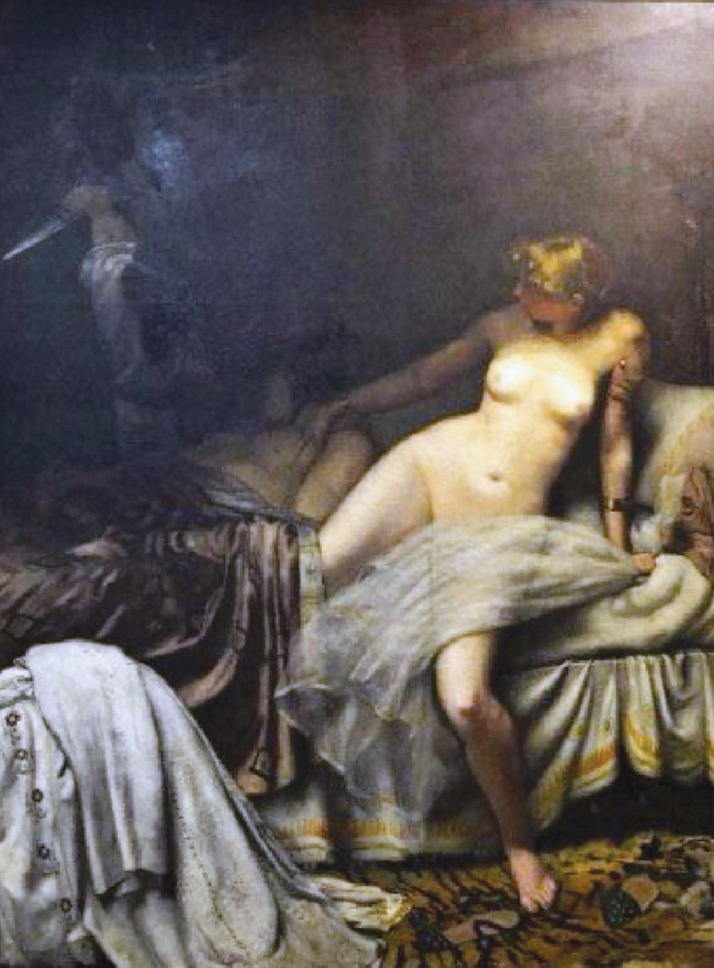 Œmieræ Kandaulesa tak¿e znalaz³a liczne odzwierciedlenie w malarstwie. Wybieram obraz innego francuskiego malarza akademickiego, Paul Louis Boucharda, który akurat specjalizowa³ siê w przedstawianiu nagich kobiet i w doœæ bezwstydny sposób (w sensie: komercyjnie nachalny) traktowa³ ten temat. Widz mia³ szansê obejrzenia sceny zabójstwa Kandaulesa tak jak j¹ opisa³ Herodot – wiêc w ³o¿u ma³¿eñskim, z nag¹ ¿ona wskazuj¹c¹ na pierœ œpi¹cego mê¿a – gdzie serce, miejsce dla zbrodniczego ciosu. Giges w tej scenie potraktowany zosta³ jako niewa¿ny osobnik, zredukowany tylko do rêki z wielkim no¿em. W wyobra¿eniu Boucharda (zgodnie zreszt¹ z Herodotem) prawdziw¹ morderczyni¹ jest królowa; to ona przecie¿ wszystko zaaran¿owa³a, zaœ Giges, który – jak wiemy, opiera³ siê zamys³owi – by³ tylko narzêdziem podstêpnej kobiety. Znajdujemy w tym obrazie, jak i w tysi¹cach innych z epoki, wyraz wrêcz chorobliwego XIX-wiecznego mizoginizmu: kobieta jest z³em, od stworzenia œwiata dzia³a na zgubê mê¿czyzny. ❍