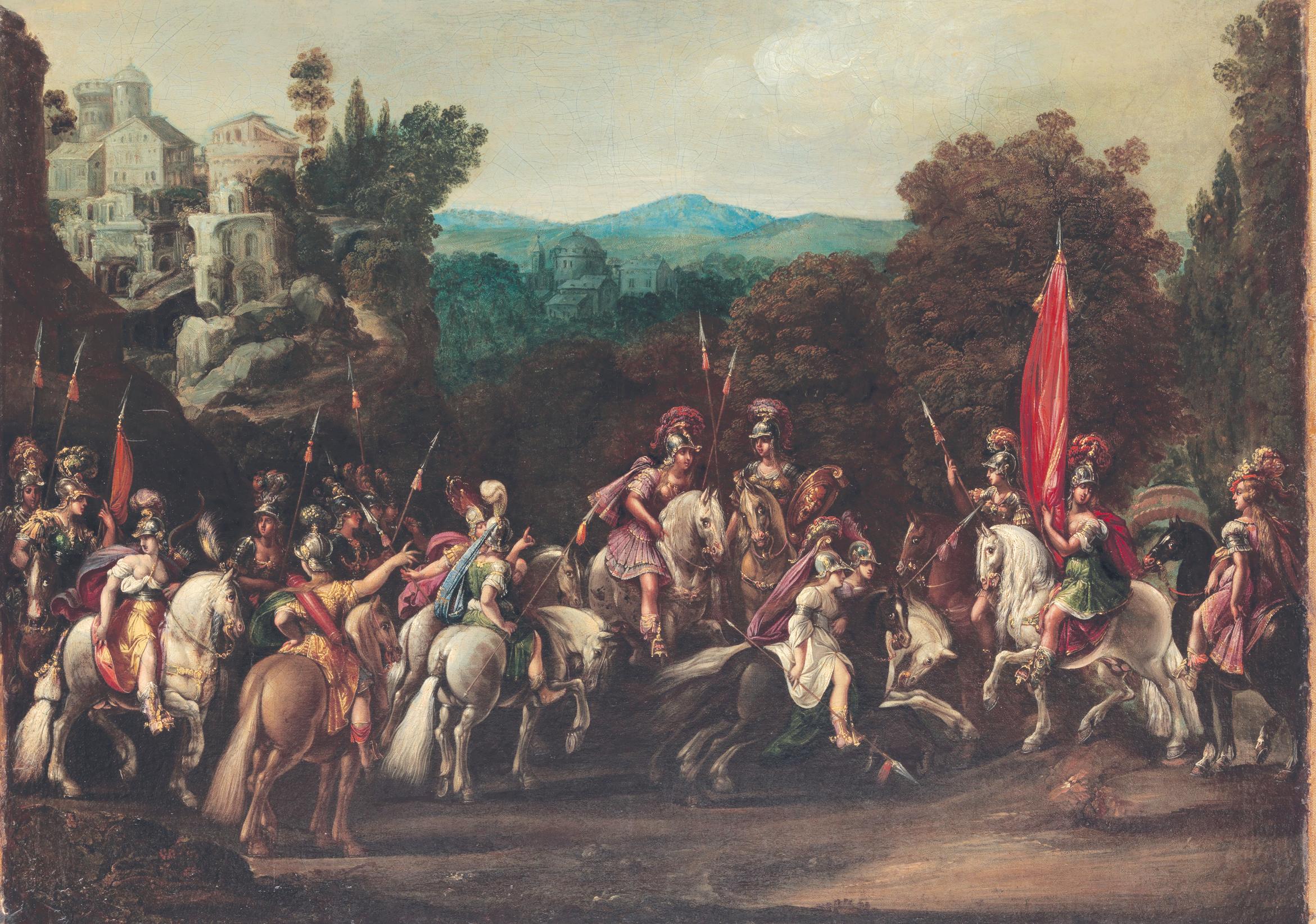 Claude Déruet (1588-1660) barokowy malarz francuski eksploatowa³ temat Amazonek na wielu obrazach luŸno zwi¹zanych z tekstem Herodota. Najistotniejsza dlañ (jak i dla wielu innych artystów) by³a malarska atrakcja: po³¹czenie przedstawienia wojowniczej, a nawet krwio¿erczej kobiety z jednoczesn¹ delikatnoœci¹, wdziêkiem i erotycznym damskim powabem. Kombinacja, jak wiadomo, zgubna dla rodzaju mêskiego – chyba ¿e siê jest Achillesem. Deruet by³ artyst¹ œredniego lotu, ale robi³, co móg³, aby urozmaiciæ swe kompozycje. Na obrazie „Wymarsz Amazonek” – jak siê domyœlamy: pod Trojê, czarowne damy w zbroi i he³mach, niektóre –jak przysta³o na owe wojowniczki – z go³ymi piersiami, wyprawiaj¹ siê konno na wojnê pod przywództwem Pentezylei –w z³otym pancerzu, ty³em do widza. Na innym, dostêpnym obrazie, Deruet przedstawi³ tê sam¹ grupê Amazonek w walce, kiedy z Pentezyle¹ na czele (w z³otym pancerzu) gromi¹ przeciwnika, bezlitoœnie k³ad¹c go pokotem.