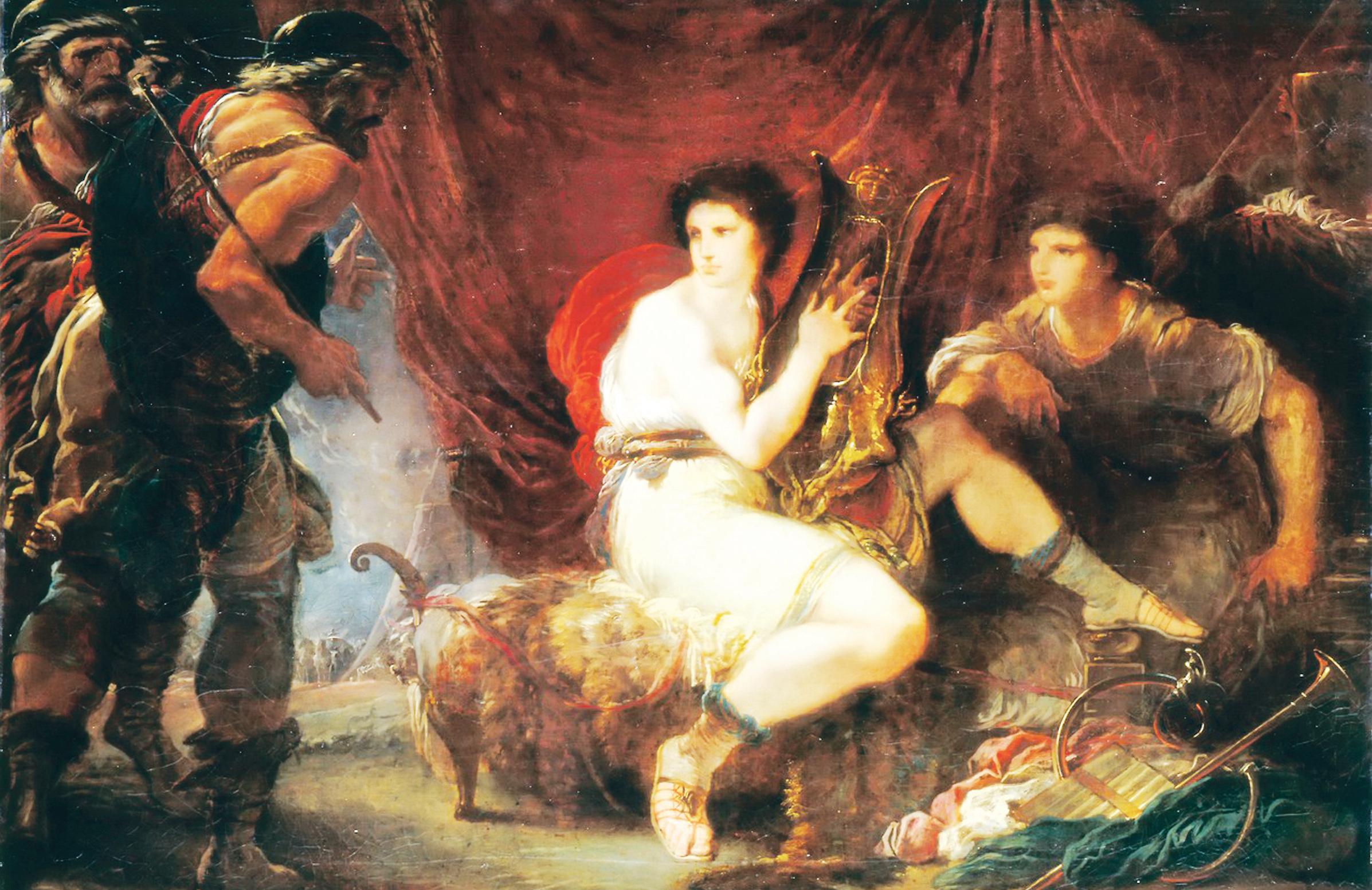 j¹c do obrazu. Miêdzy nimi nie ma ¿adnego zwi¹zku, poza malarskim wymogiem: Odyseusz w czerwonej opoñczy –z przodu, Ajas – pó³nagi, przedstawiony od ty³u, nienaturalnie napina musku³y i stary Fojniks – tak¿e niemal go³y. Z drugiej strony go³y Achilles (z lir¹) zrywa siê na widok goœci. Obok Patrokles stoi nagusieñki, ale za to w he³mie na g³owie. Bez sensu, choæ zapewne artysta chcia³ zaznaczyæ wyraŸnie homoseksualny zwi¹zek miêdzy tymi dwoma wojownikami.