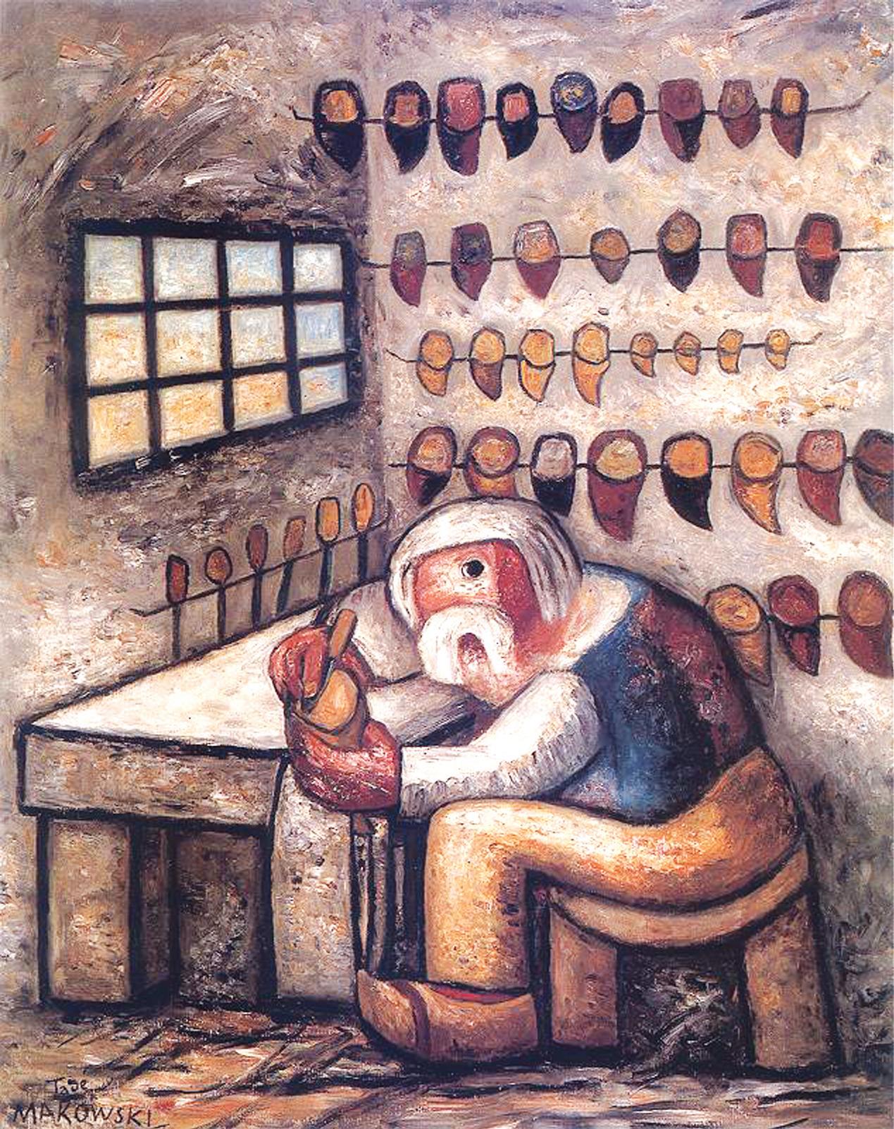 Na uproszczonym, „kukie³kowym” wizerunku siedzi stary, siwy, jednooki „cyklop” na zydlu. Przed sob¹ ma warsztat – stó³ i narzêdzia. Na œcianie z boku wisz¹ rzêdem w ordynku buty jak sapogi – podobne do tych, które ma na nogach. Szewc spogl¹da na nas, widzów, jednym okiem – cz³owiek zanikaj¹cego zawodu. Jeden z ostatnich rzemieœlników, bo przemys³ obuwniczy spycha go na margines. Wkrótce przestanie byæ potrzebny. Jest postaci¹ nieco anegdotyczn¹, trochê jak z bajki – taka zreszt¹ by³a intencja artysty – zobrazowania marionetkowej figury, którego zajêcie zwykle samotne, w jakimœ piwnicznym pomieszczeniu, budzi ogromn¹ ciekawoœæ doros³ych i dzieci. Kompozycja Makowskiego jest szalenie uproszczona, kolory – we wszelkich odcieniach lekkiego br¹zu. ¯adnych zbêdnych dodatków, elementów ubarwiaj¹cych wizerunek o „realistyczne” szczegó³y przedstawienia. Jest to szewc w swej istocie, wizerunek kwintesencji rzemieœlnika w popularnym wyobra¿eniu.