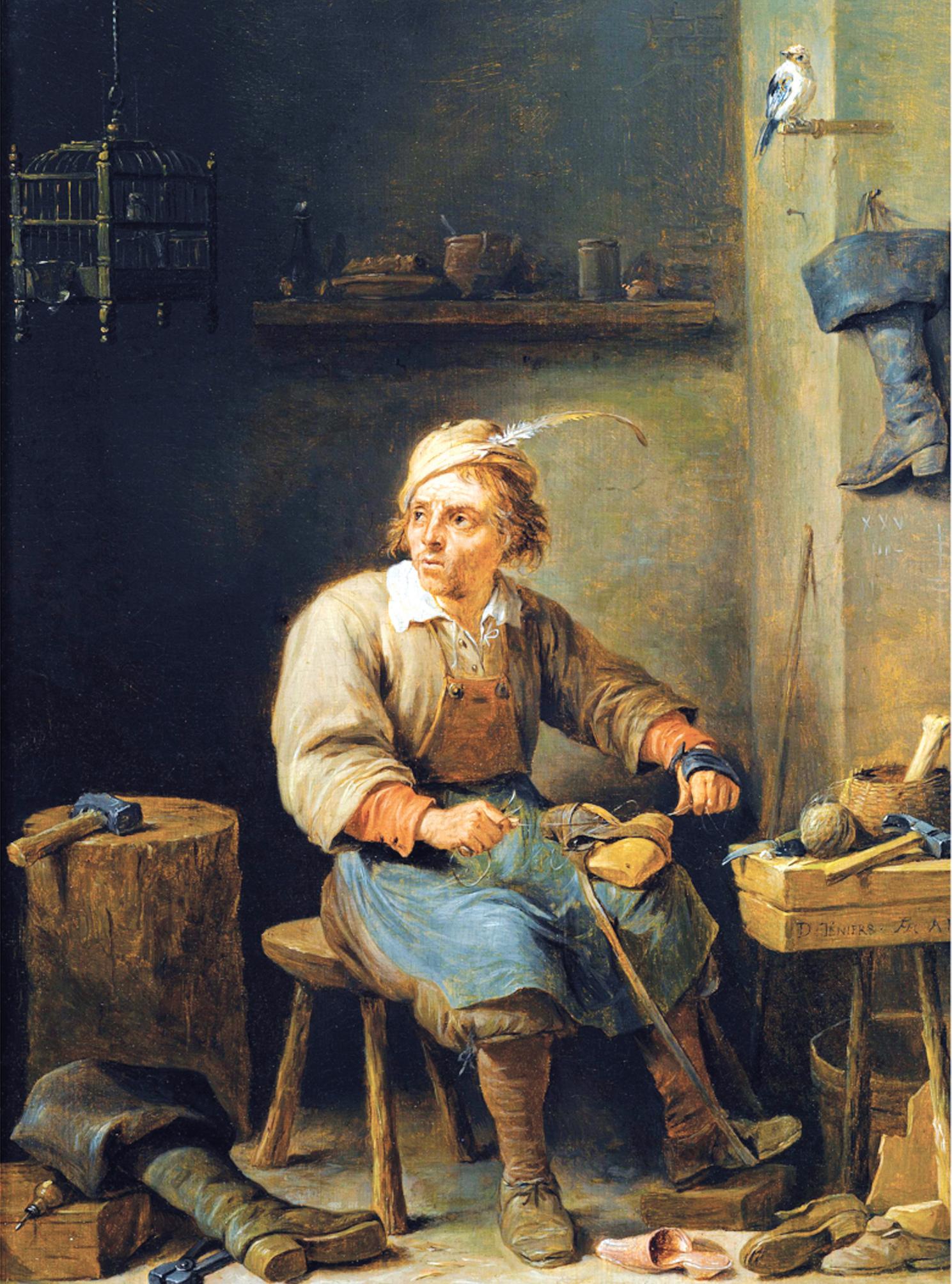 M³odszy. Jak „M³odszy”, bo by³ i „Starszy”, ale o nim mo¿e przy innej okazji. By³ – tak¿e dziêki ojcu – doskonale ustawiony w ¿yciu, w tamtejszej spo³ecznoœci, równie¿ na dworze ksi¹¿êcym w Brukseli, dok¹d siê przeprowadzi³ wraz z ¿on¹ z domu Brueghel – ze s³ynnej rodziny malarskiej. Malarz wszechstronny, rozmaity, tworzy³ pod ka¿de gusta. Jednym z nurtów jego twórczoœci by³o malarstwo rodzajowe, powszechnie cenione wœród nabywców flamandzkich, jak i niderlandzkich. I tu znajdujemy „Szewca w warsztacie” – obraz inny w wymowie. Wbrew tradycji szewc Teniersa jest cz³owiekiem wzglêdnie m³odym. Siedzi na zydlu, tak¿e w bardzo skromnie wyposa¿onym warsztacie. Podobnie jak rzemieœlnik Ryckaerta, paskiem umocowa³ but, nad którym pracuje, do uda – stopa naci¹ga rzemieñ, aby rzecz mocno trzyma³a siê nogi. Wokó³ typowe narzêdzia – m³otek, obcêgi, d³uto, wiert³o, dratwa. Na pod³odze walaj¹ siê stare, zniszczone trzewiki do naprawy. Ot, scenka rodzajowa. Sens obrazu komunikuj¹ dwa wielkie buty z cholewami – ¿o³nierskie, w stylu hiszpañskim, skoro na obszarze tym wówczas królowali Hiszpanie. Jeden le¿y z lewej strony, wygl¹da jak odciêta noga. Drugi wisi na œcianie, a nad nim na ¿erdce siedzi ptaszek. No tak, ów m³ody cz³owiek marzy³ niegdyœ o wolnoœci, profesji ¿o³nierskiej, swobodzie, przygodzie, wêdrówce przez kraje Europy i œwiata, zadawaniu szyku. Kariera z³amana, mo¿e by³y to tylko mrzonki niezrealizowane z powodu niskiego stanu, braku pieniêdzy, choroby. Raczej na pewno jednak codziennoœæ zweryfikowa³a jego m³odzieñcze pragnienia – ¿ona, dzieci przyku³y go do szewskiego sto³ka. Nie zerwa³ jednak ca³kowicie z dawnymi têsknotami; czapka z fantazyjnym piórem oraz wzrok skierowany gdzieœ w przestrzeñ – z dala od smêtnej rzeczywistoœci zydla, ciasnego pomieszczenia warsztatu i szewskiej profesji mówi wszystko. Marzy o ¿yciu niespe³nionym.