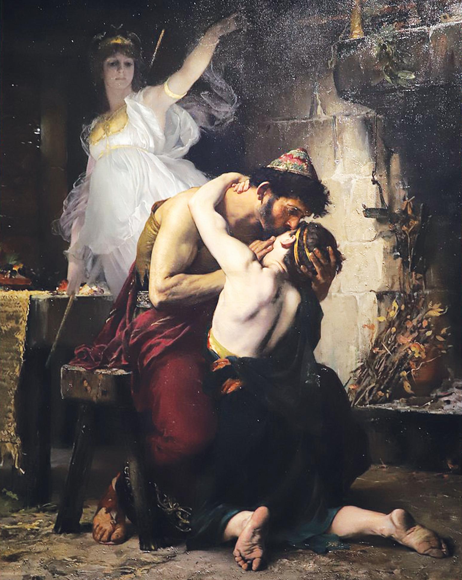 Przekonawszy siê, ¿e syn stoi po jego stronie, Odyseusz wyjawia mu, kim jest. Na tê chwilê, Atena przywraca mu wspania³y, królewski wygl¹d. Po serdecznym powitaniu, zobrazowanym przez francuskiego akademika, Henri-Lucien Douceta, malarza paryskich salonów, któremu to rozpoznaniu patronuje bogini Atena, ojciec i syn zasiadaj¹ do u³o¿enia starannego planu wojny z zalotnikami. Odys nakazuje Telemachowi wracaæ do domu i przede wszystkim przyjrzeæ siê wszystkim biesiadnikom: ilu ich jest i kto zacz. Ma siê z nimi na pozór zbrataæ, aby stracili czujnoœæ. Korzystaj¹c ze sposobnoœci ma wynieœæ z sali biesiadnej wszelk¹ broñ znajduj¹c¹ siê na œcianach i pod ³awami. Nastêpnie przekonaæ siê, kto ze s³u¿by pozosta³ wierny prawowitemu gospodarzowi, a kto zaprzeda³ siê nowym panom. Naturalnie nie wolno nikomu, nawet Penelopie, mówiæ o powrocie Odysa do ojczyzny. Ja, powiada, przyjdê tam póŸniej. Nikt mnie nie pozna, wiêc bêdê siê stara³ jako ¿ebrak wkraœæ w ³aski biesiadników, aby zostaæ w pa³acu.
