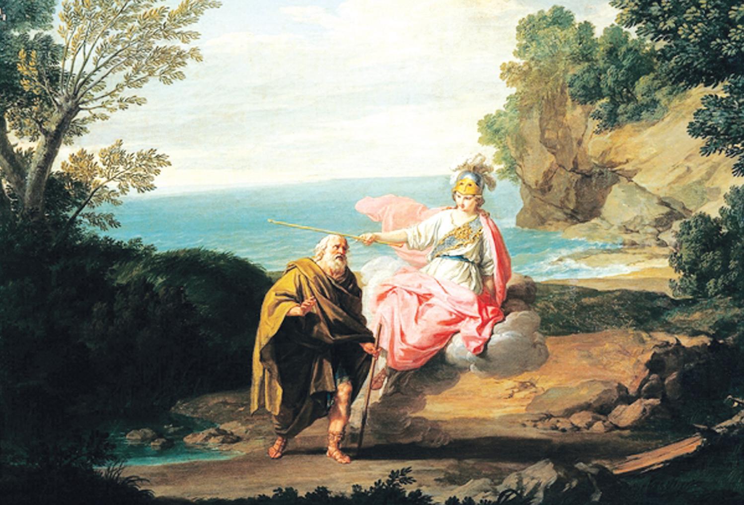 Jak wygl¹da³a ta cudowna metamorfoza czytelnik mo¿e sobie wyobraziæ na podstawie obrazu Giuseppe Bottaniego, artysty, który uchwyci³ ów moment przemiany œwietnego wojownika w nêdznego starego ¿ebraka. Atena dotyka magiczn¹ ró¿d¿k¹ bohatera (m³odszy czytelnik myli siê s¹dz¹c, ¿e ró¿d¿ki czarodziejskie wymyœlono dopiero dla Harry Pottera; znane by³y od staro¿ytnoœci) i presto! Mamy kogoœ z wygl¹du zupe³nie innego.