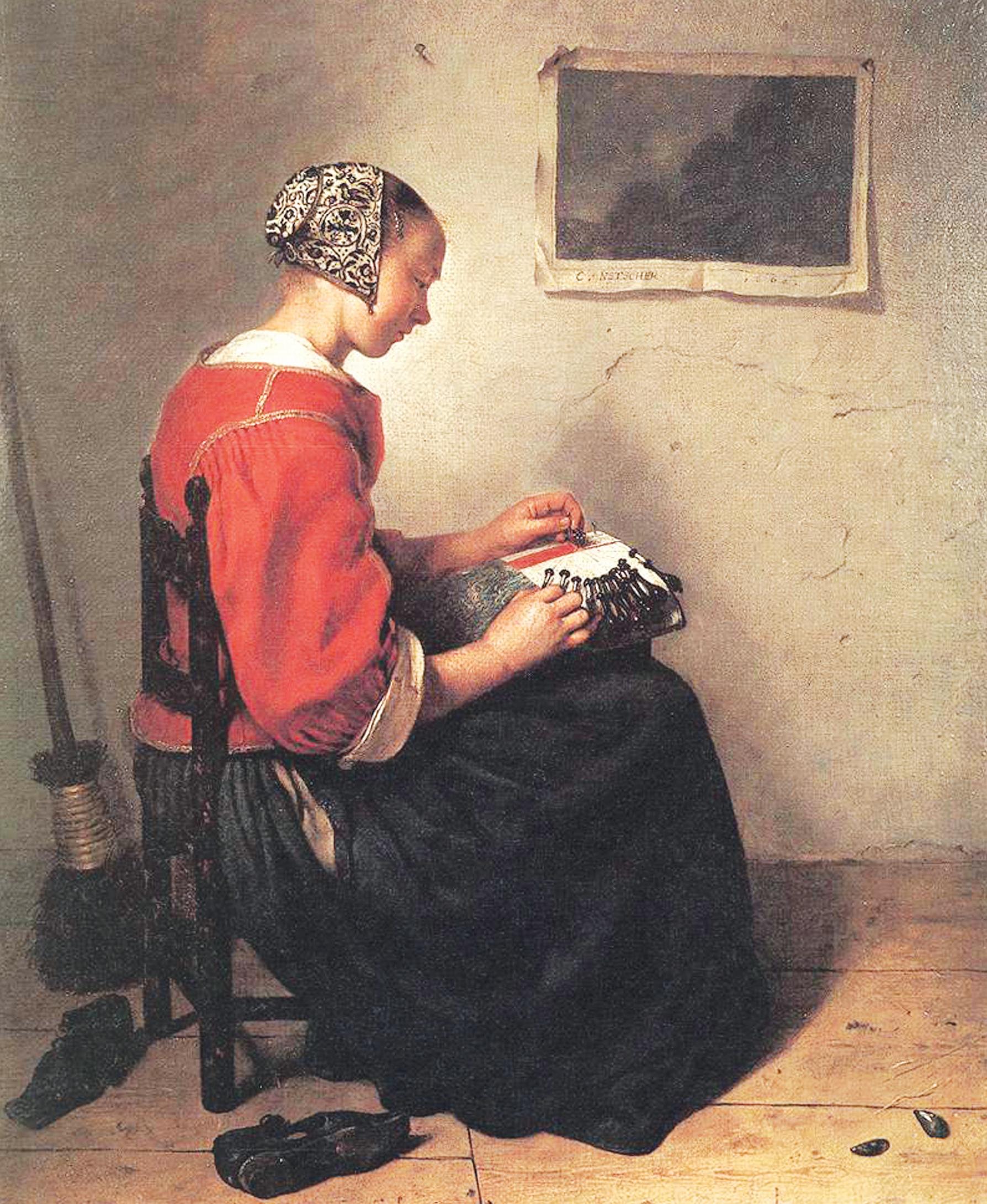 nie zaskakiwaæ, skoro obaj twórcy wyrastali i pracowali w œwiecie identycznych wartoœci spo³ecznych – pochwa³y schludnoœci i porz¹dku, kultu pracy jako jedynej i prawdziwej drogi do dobrobytu (i religijnego zbawienia), apoteozy oszczêdnoœci i skrzêtnoœci codziennego bytowania mieszczan, ¿yj¹cych jakby w opozycji do rozrzutnych dworów szlacheckich. Koronczarka Netschera, wziêtego malarza swoich czasów, któremu patronowa³ sam król, siedzi obok miot³y, innego wa¿nego narzêdzia zajêæ domowych. Pod³oga jest czysto zamieciona, le¿¹ tylko wyraŸnie celowo zostawione jakieœ dwa kamyki czy muszle i para nieco zu¿ytych butów do prac gospodarskich. Kobieta jest porz¹dnie, by nie powiedzieæ – elegancko ubrana, choæ bez wystawnej okaza³oœci, ani te¿ zbêdnych, kosztownych ozdób. Nie ma mowy o jakichœ roboczych, byle jakich strojach. Ma na g³owie haftowany czepek. Na kolanach trzyma poduszkê koniecznego podk³adu do wyrobu koronki, z boku zwisaj¹ owe „patyczki” z niæmi. Ogl¹damy j¹ z profilu, siedzi bokiem do widza i ty³em do okna, sk¹d pada s³aby cieñ kobiety na go³¹ œcianê, a oœwietla jej pracê. Podobnie jak u Vermeera œwiat³o jest rozproszone, bez ostrego kontrastu, g³êbokich cieni, które by³y ju¿ w modzie w owym czasie w innych krajach. Ten chwyt artystyczny pozwala na zakomunikowanie wa¿nych sensów obrazu: spokoju domowego zacisza, skupienia na wykonywanej pracy, wolnych, gospodarskich zajêciach. ❍