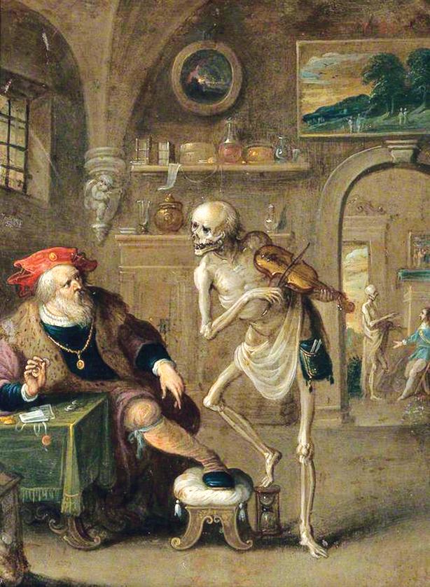 I dalej na ten sam temat, tym razem w wykonaniu flamandzkiego artysty, Fransa Franckena, popularnego w XVII w. artysty z Antwerpii. Jego „Sk¹piec i œmieræ” cieszy³ siê swego czasu wielkim wziêciem. Typowy taniec œmierci z oczywistym przes³aniem: gromadzone skrzêtnie bogactwa nie maj¹ w istocie wartoœci w obliczu spraw ostatecznych. Ów tytu³owy sknera siedzi z ewidentnie chor¹ nog¹ (podagra – skutek nadmiaru t³ustego jedzenia). Przez ca³e ¿ycie dogadza³