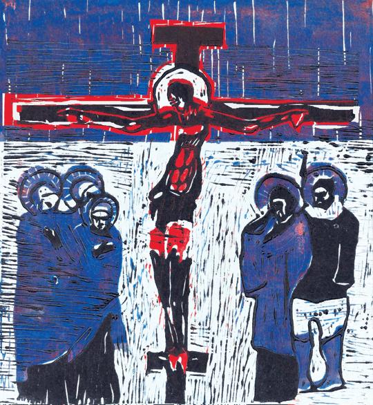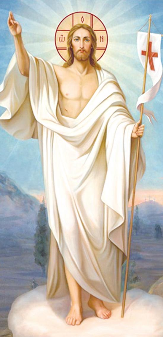 Jezus dominuj¹cy nad ca³oœci¹ przedstawienia trzyma w rêku tzw. sztandar triumfu – czerwony poziomy krzy¿ na bia³ym polu. Standardowy symbol zmartwychwstania, zwyciêstwa nadœmierci¹, oznaka nadziei – to stary atrybut, wywodz¹cy siê z IV wieku. Dziœ, gdy go widzimy z ka¿dym barankiem wielkanocnym; pamiêtajmy, to nie zwyk³a ozdoba, ale dawny, znacz¹cy wiele symbol.