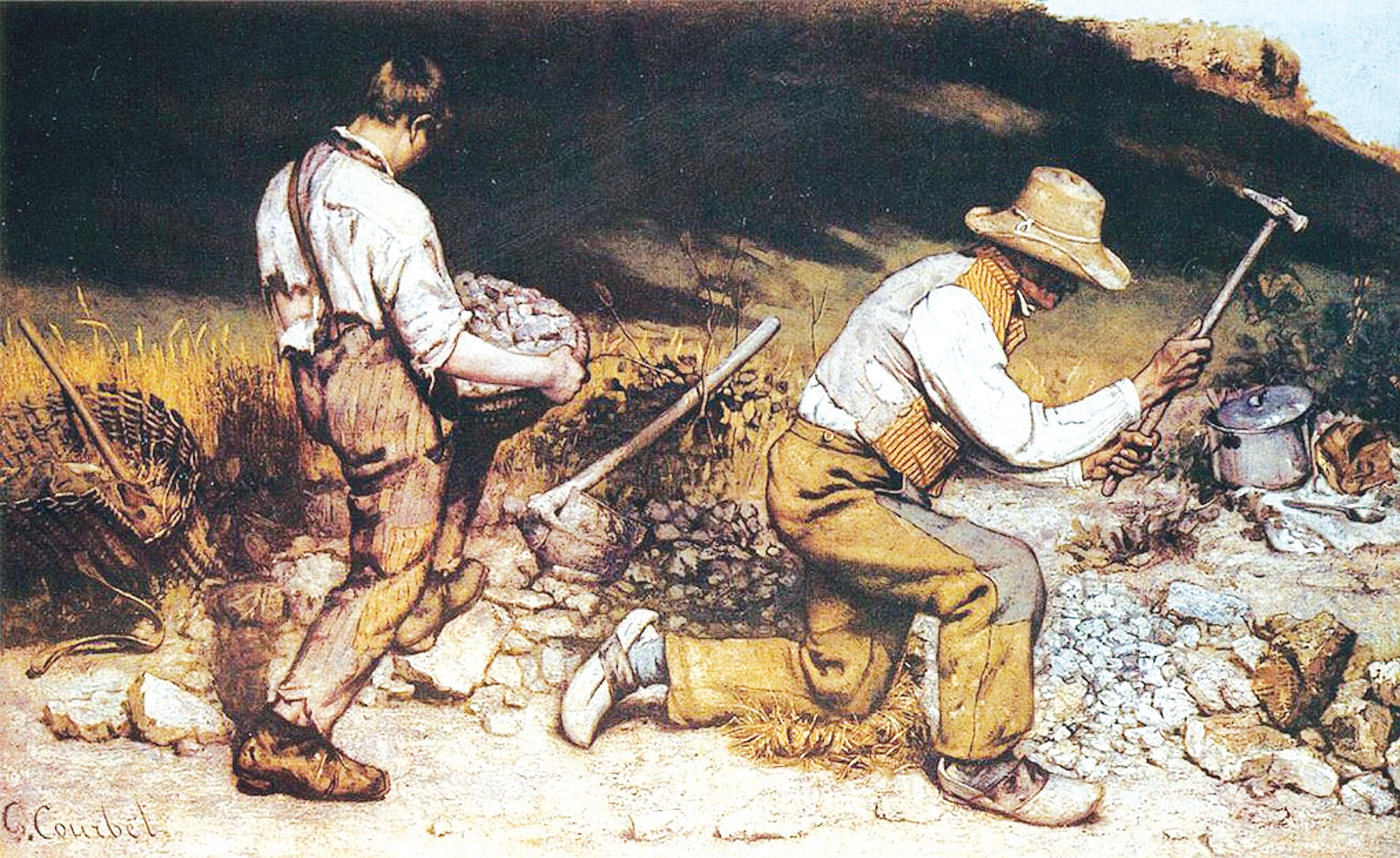 Starszy, doœwiadczony kamieniarz t³ucze m³otkiem wapienne bry³y. Strój roboczy w ³atach, dziurach, postrzêpiony gdzieniegdzie i drewniane saboty na nogach to nie tylko wyobra¿enie autentycznego ubioru robotnika drogowego tamtych lat. To przede wszystkim artystyczne odkrycie romantyki nie dostrzeganego dotychczas, pomijanego obszaru rzeczywistego – swoistego piêkna, egzotyki; nowej barwy codziennoœci. Jak dziœ, wielu woli fotografowaæ (bo ta sztuka króluje) bezdomnych, w³óczêgów, kontestatorów, upatruj¹ w nich swoist¹ poezjê i urok ludzi odstaj¹cych od normalnego ¿ycia. Oni przecie¿ s¹ obok nas, tylko trzeba ich zauwa¿yæ, zarejestrowaæ ich bytowanie. Tak¹ sam¹ rolê spe³nia³o prawie dwieœcie lat temu dzie³o francuskiego malarza. Ten strój byle jaki m³odego pomocnika, jego zdarte buty, kosz t³ucznia, który dŸwiga, proste, zwyczajne narzêdzia, garnek z zup¹ i ³y¿k¹, przygotowane drugie œniadanie, detale ¿ycia i pracy dotychczas znajduj¹ce siê poza zainteresowaniem malarskim. Twarzy robotników nie widzimy – niemal ty³em do nas i zakryte szerokimi rondami kapeluszy. Nie s¹ to indywidualne, konkretne postaci, ale typy ludzkie – zjawisko przydro¿ne, na które kieruje uwagê artysta.