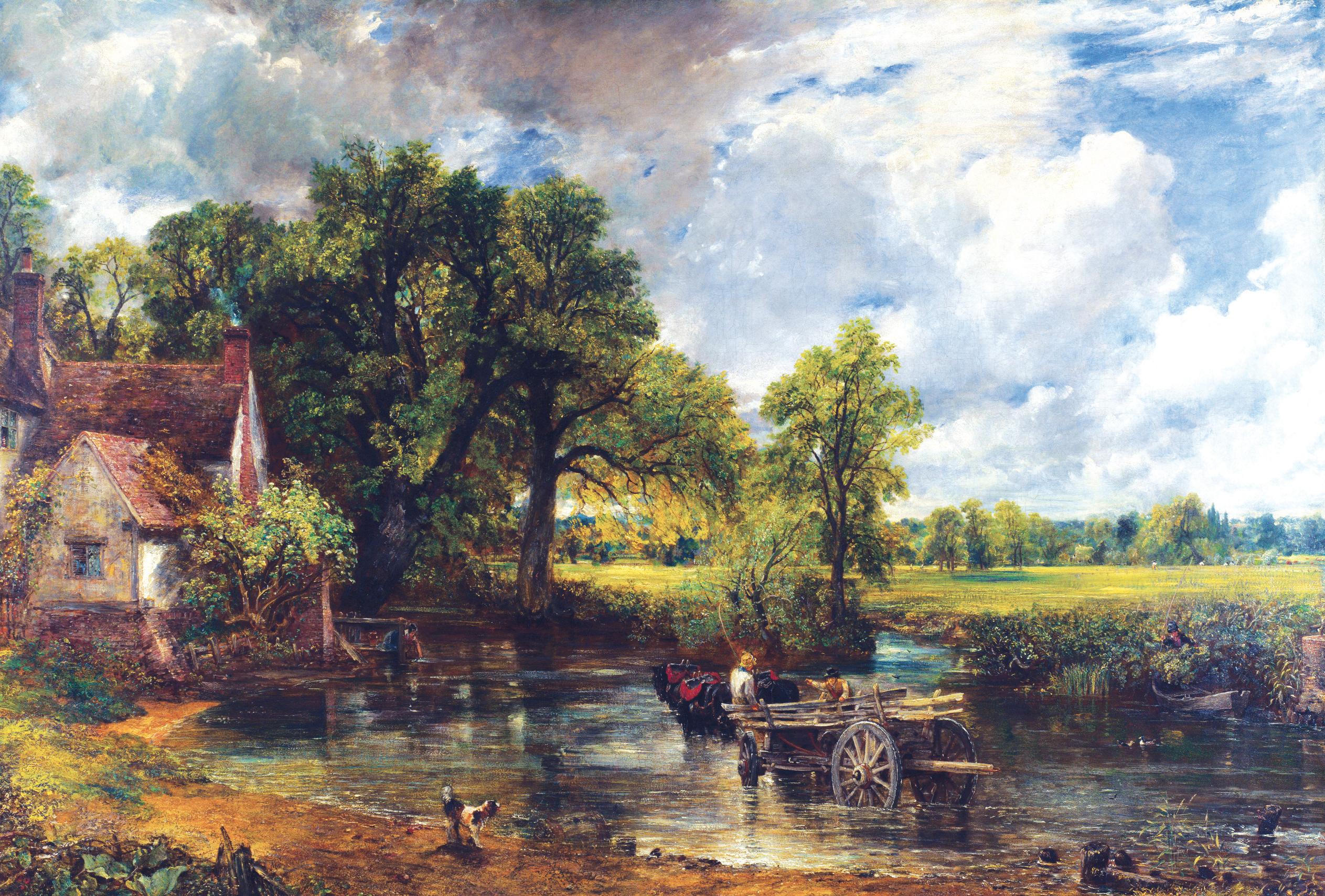 Na pocz¹tek s³ynny (w Wielkiej Brytanii) „Wóz na siano” Johna Constable’a – chyba najpopularniejszy na wyspach obraz rodzajowy. Wielkich rozmiarów dzie³o przedstawia wóz zaprzêgniêty w trzy konie, którym dwaj ch³opi wjechali do rzeki. Z lewej dom z m³ynem, z prawej – otwarta perspektywa szerokiej ³¹ki. Wzd³u¿ brzegu biegnie pies, obszczekuje woŸniców, zapewne dlatego, ¿e wjechali do wody. I tyle. Zdawa³oby siê – nic nadzwyczajnego.