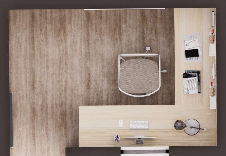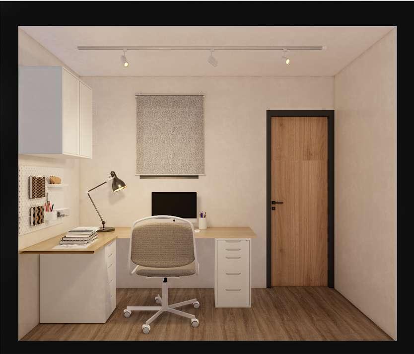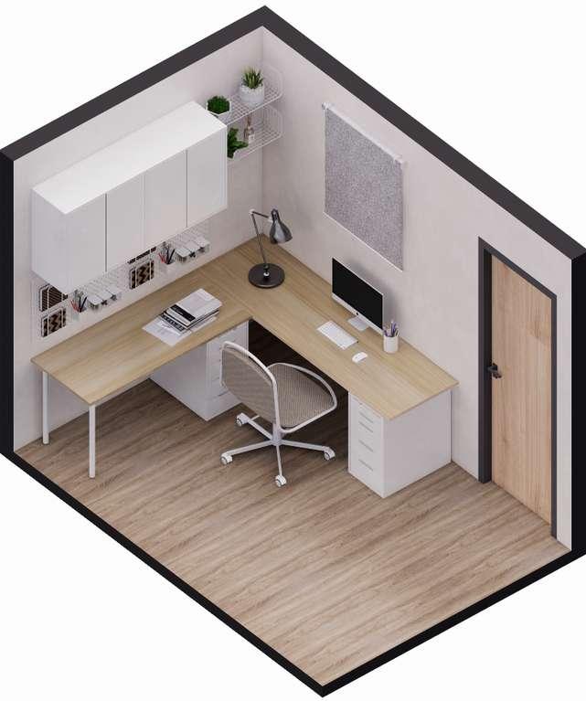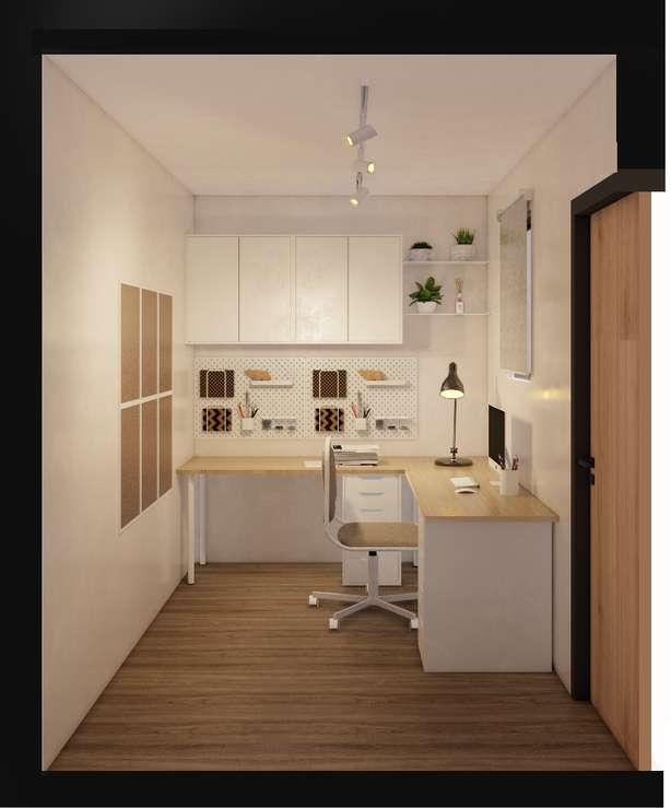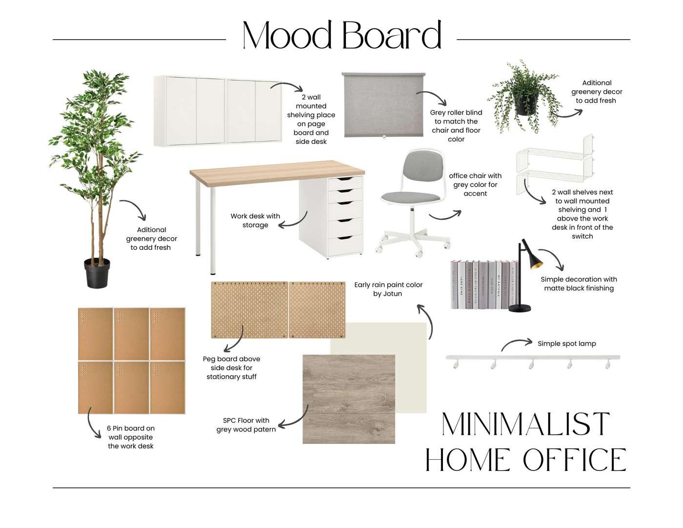 To achieve this, the design considerations include using bright and warm toned paint on the walls, and covering the floor with a cozy grey wood patterned vinyl floor. A functional minimalist desk from Ikea is strategically placed near the window, with two Ikea Alex tables arranged in an L shape. The longer table serves as the main computer area, while the shorter table acts as a side desk. Ample storage options, both closed and open, are incorporated to maintain a minimalist style.