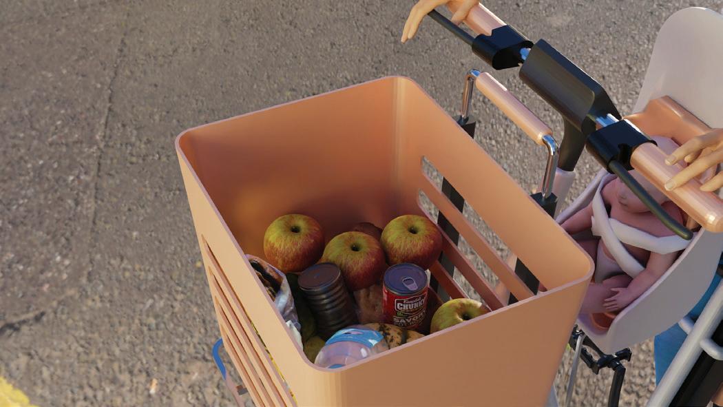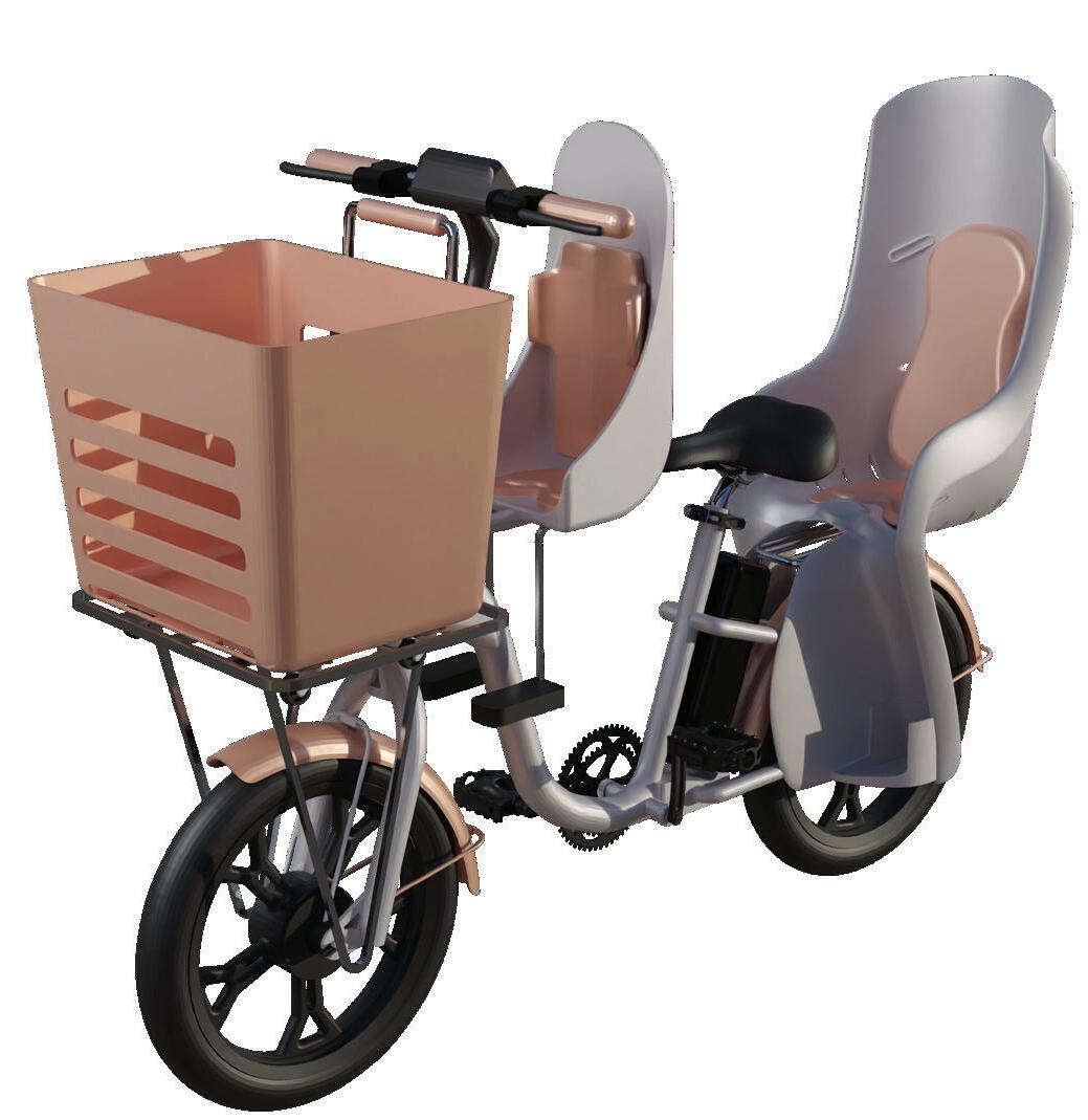Customizable bike with numerous configurations for moms on-the-go, including a detachable baby seat, toddler seat, and a basket that can be used as a shopping cart for carrying groceries