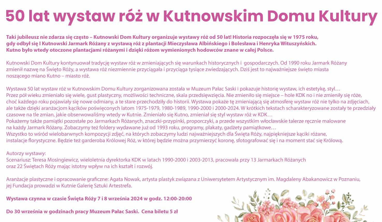 Wystawa, mapping 3D i Eska Podczas festiwalu 7 i 8 września będziemy mogli obejrzeć wystawę pt. „50 lat wystaw róż w Kutnowskim Domu Kultury”,