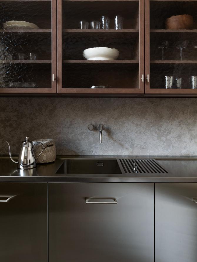 Atelier är konstfullt och osökt, okonstlat och utsökt. Kökets snickerier består i huvudsak av målad ask. Ännu en interiör signerad Per Fernholm, på en gång enkel och raffinerad, stram och lekfull, en hyllning till finsnickeriet och dess utövare.