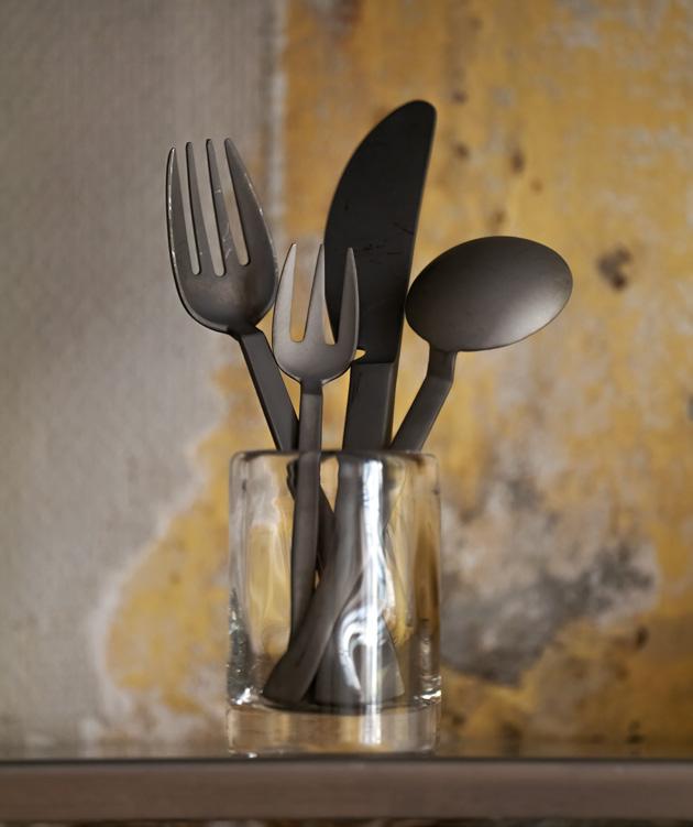 En pall, mer att titta på än sitta på, en låda på högkant som nattduksbord, ett runt bord erinrande om en kabeltrumma, en bänk i cortenstål med en märkligt organisk känsla, krus, vaser, kärl, ett rektangulärt matsalsbord med rätvinkliga stolar, ett badrum med återbrukat tvättfat, lika enkelt som intrikat, och ett klassiskt emaljerat badkar försett med fötter i rostigt järn, allt utfört med finess och underfundig humor. Vad ska man kalla det?