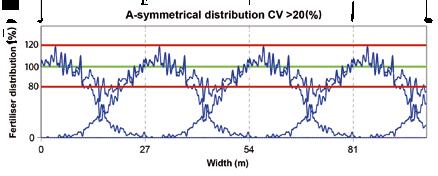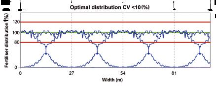 An important factor for an optimal spreading pattern is the CV. This is the percentage of deviation of the spreading pattern compared to a uniform distribution. The evenness of the transversal distribution for fertiliser spreaders shall be such that the calculated value of the coefficient of variation (CV), when driving to and from, does not exceed 15% calculated in accordance with EN 13739-2 (SOURCE: NEN-EN 13739-2 (EN)).