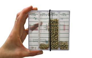The granular size distribution and quality (different size of fertiliser) can be measured with the Kverneland granule size box. The result of the granular analysis determines the letter setting of the spreader, which is used to optimise the spreading pattern in the field, in relation to the required working width.