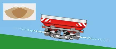 Kverneland spreaders do not drop off the fertiliser on the vanes, but instead release it from the pre-chamber on the vanes where both have the same speed, which means no fragmentation of fertiliser. The benefit is a precise spreading pattern in flat conditions, but also, especially in hilly conditions.